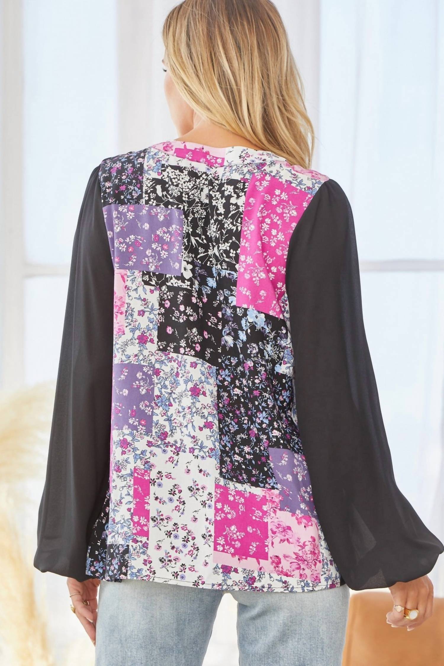 Top with V-neckline, solid black balloon sleeves with elastic at the wrist, and patchwork floral design with a beautiful mix of colors. 100% rayon, sleeves 100% polyester. Hand wash cold. Small: Bust 38", Length 26". Medium: Bust 40", Length 26". Large: Bust 42", Length 26".