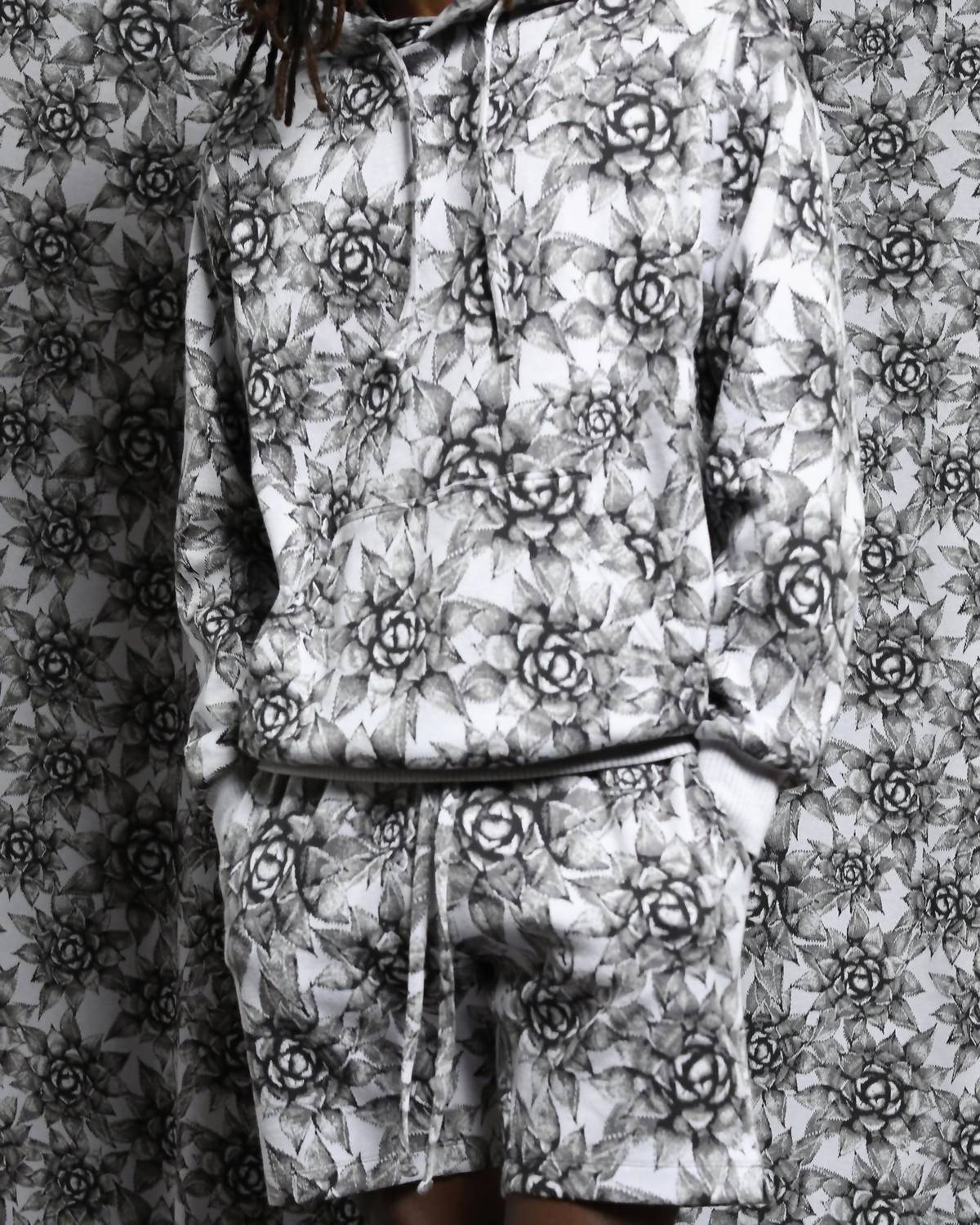 Custom milled Hyper Reality fabrication in Agave pattern. Adjustable drawstring. Custom ribbed cuffs and waist. Long sleeve.