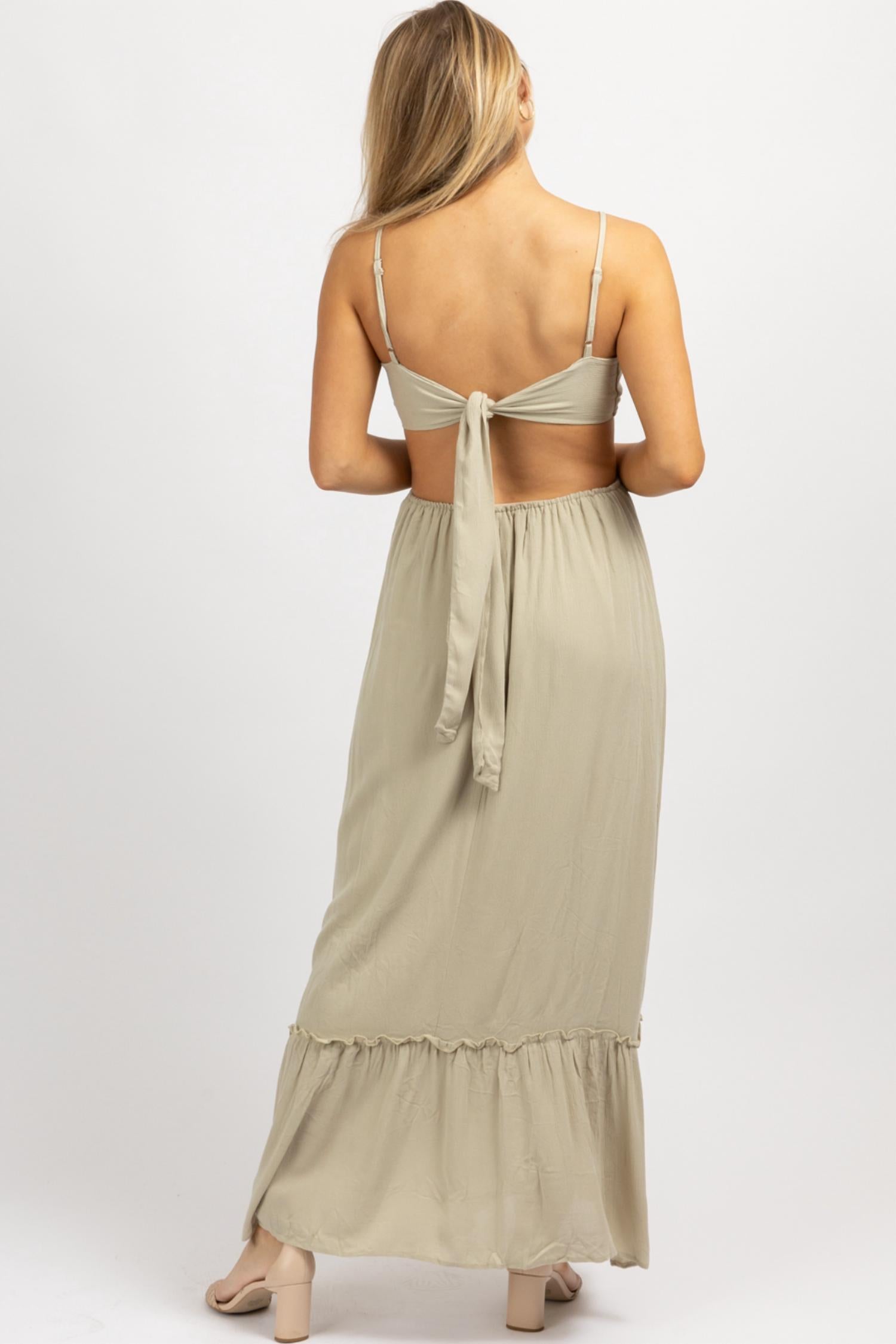 Cutout side, open back, tie back, open front, adjustable straps.100% rayon. The model is wearing a size small. Height 5'8, and the dress size 2.
