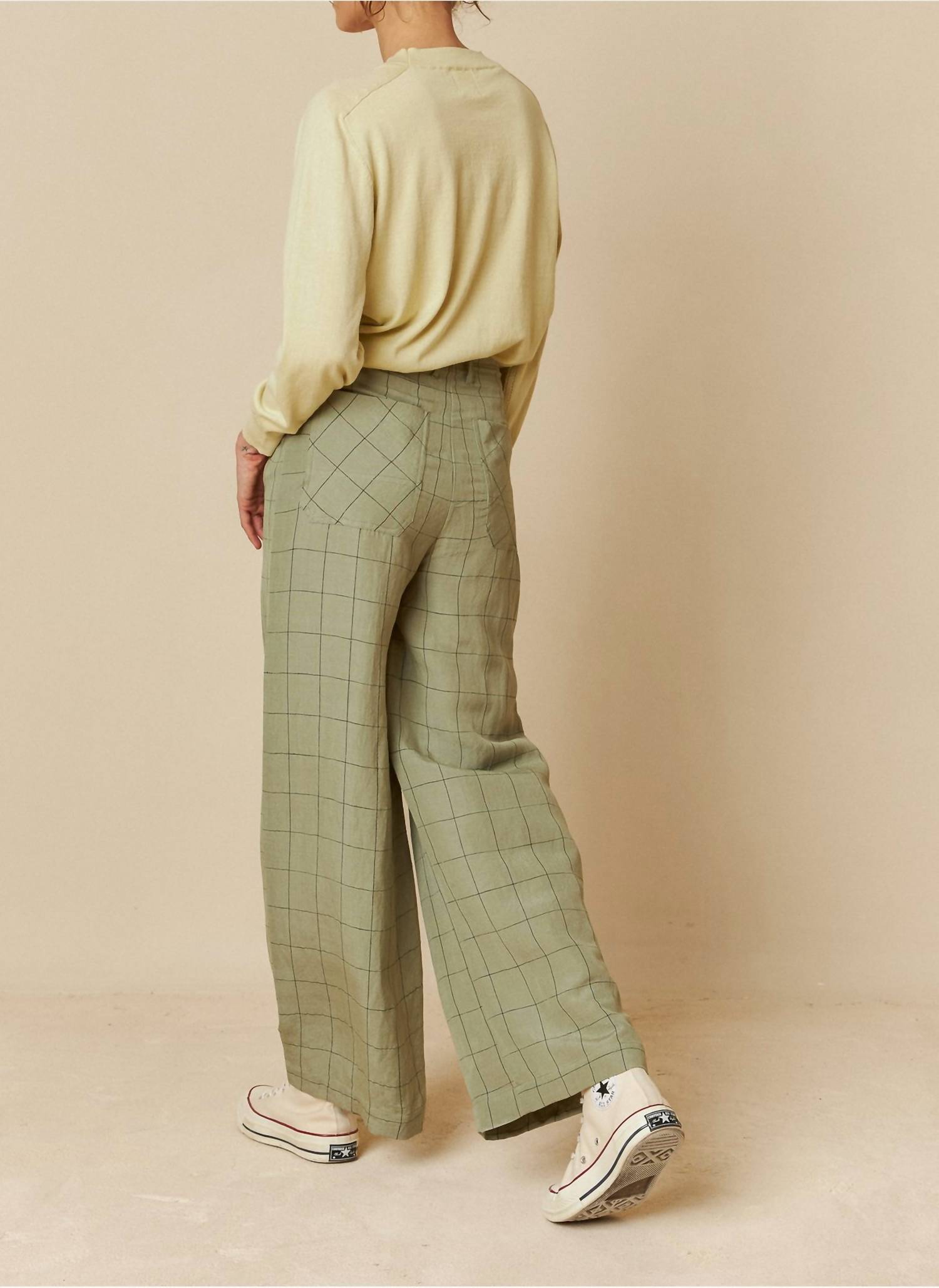 Presenting the Window Pane Check Pants by Indi & Cold, a chic addition to your wardrobe in a striking Liquen shade. With a high-rise design and relaxed fit, these pants feature hidden front pockets, and a two-tone check pattern in a cotton and linen blend. Composition: 55% Linen, 45% Cotton. Closure: Zipper and button closure. Made in India. Care: Machine wash. Measurements for size 36: Rise: 11.8, Inseam: 26.77.
