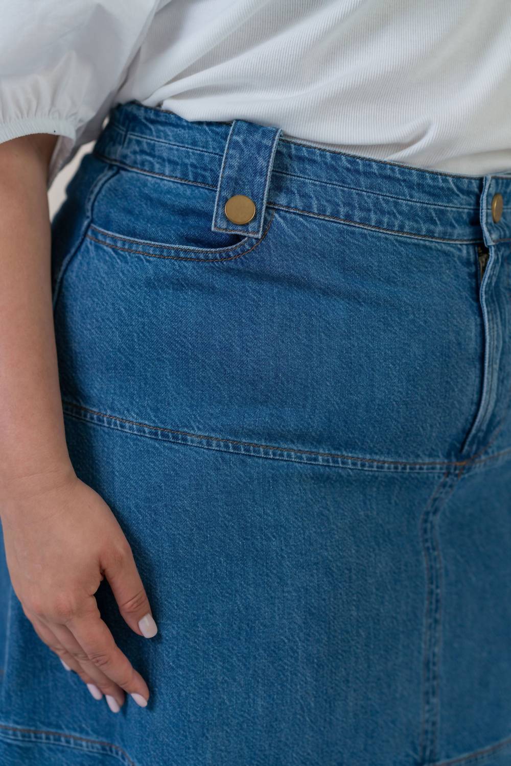 The midi length skirt is here to stay and we especially love this style. The Hudie Denim Skirt by Tanya Taylor, in a medium indigo hue, is a stylish update ready to enhance your spring wardrobe. Designed with a high-waisted, A-line shape and accented with gold hardware, this Plus-size skirt offers a flattering fit with thoughtful tiered seaming. Closure: Button closure. Pockets: Yes.