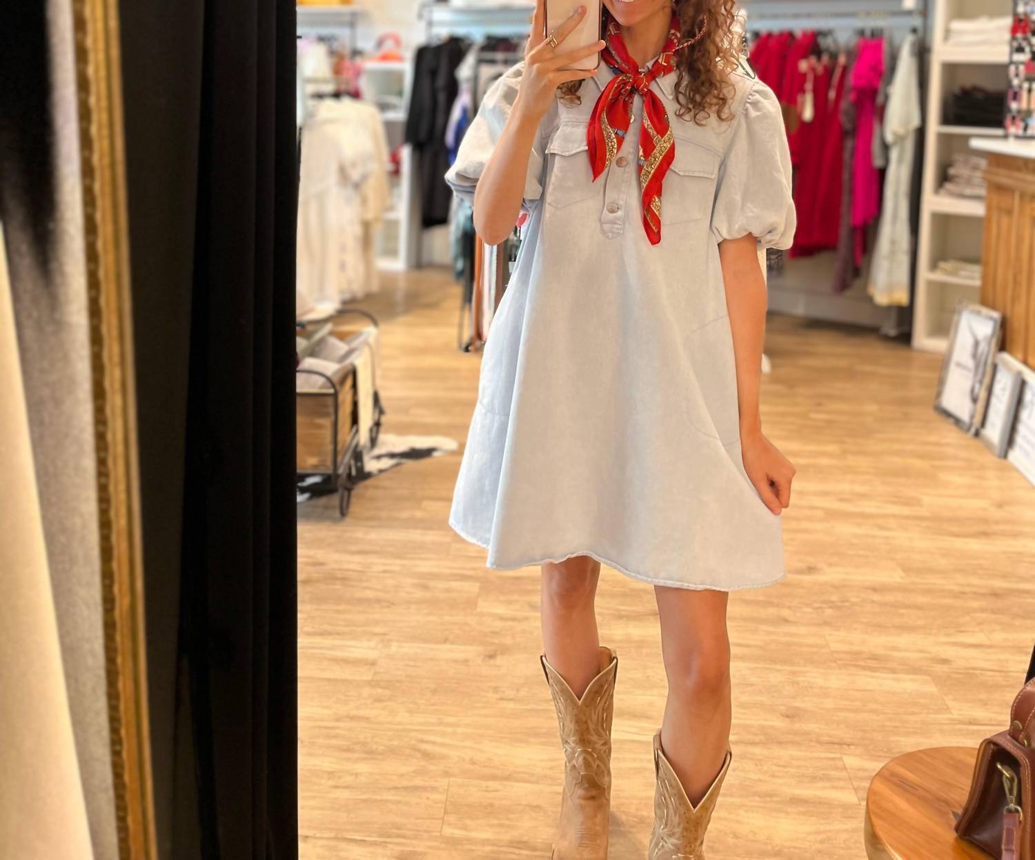 The perfect mini dress for those warmer months. Introducing the Daniella Cotton Mini Dress by &merci, a chic denim piece perfect for summer workwear or a festive cocktail party. This solid A-line mini dress features short sleeves and a stylish collar, offering effortless style with its pull-on closure. Crafted from 100% cotton, it includes convenient pockets for added functionality. Care for this garment is simple with machine wash and tumble dry instructions, making it a practical addition to your wardrobe.