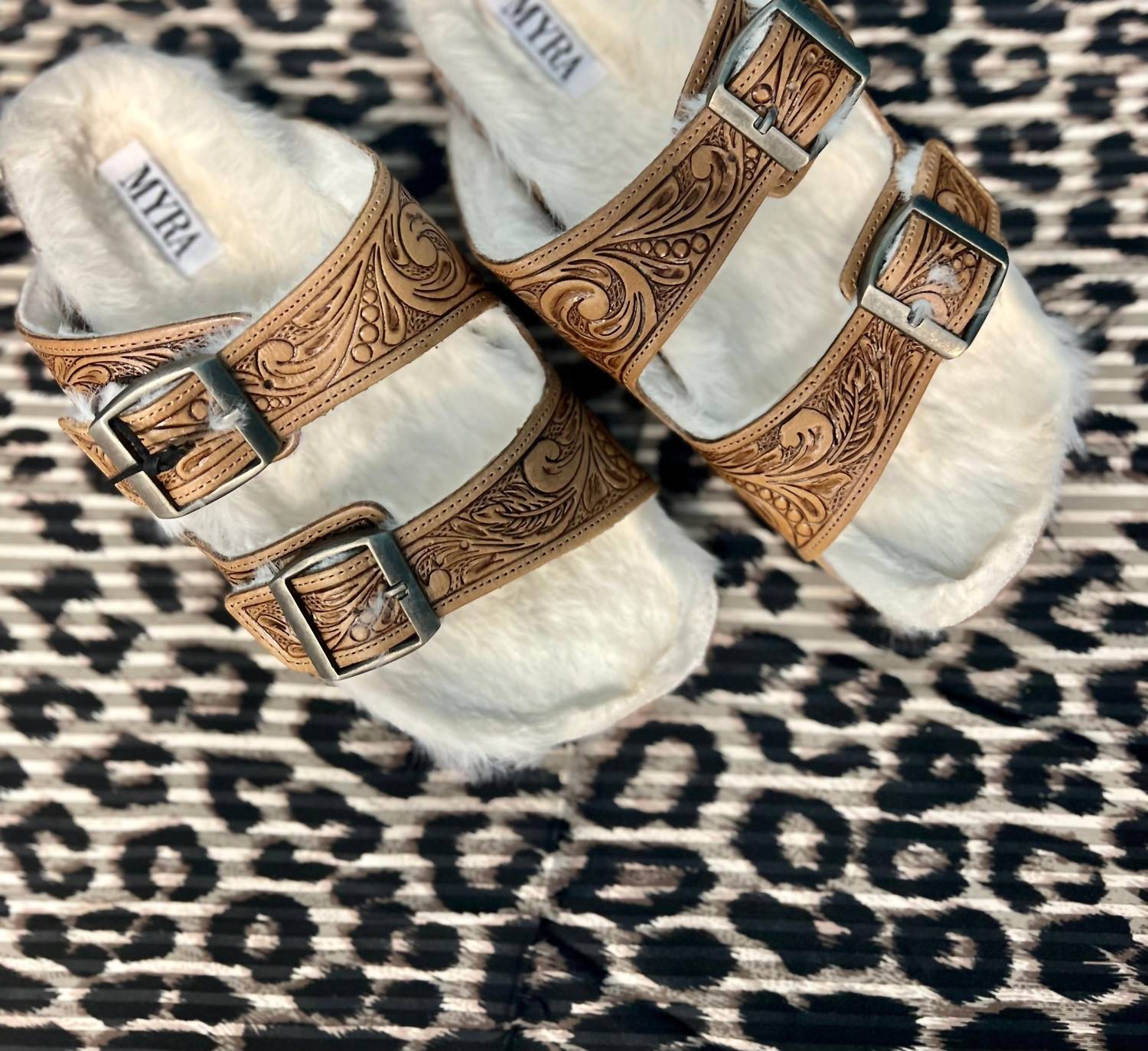 This sandal will take you from brunch to dinner and everything in between. Crafted from premium leather, these brown sandals feature a soft white fuzzy lining and two adjustable buckles for a customized fit. With a durable rubber sole, step out confidently while enjoying elegance and cushioned comfort.
