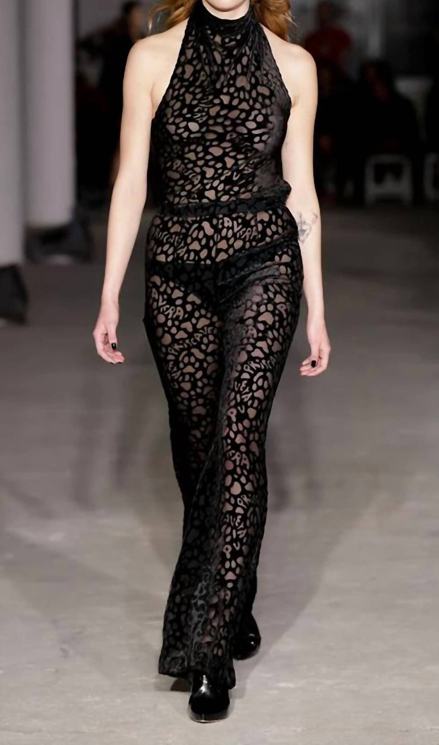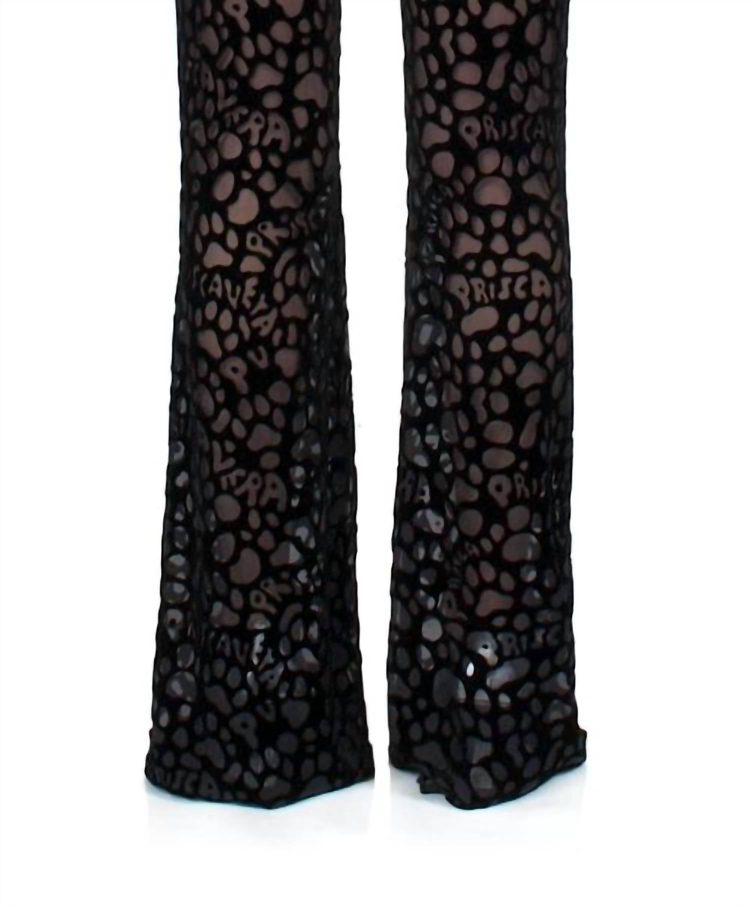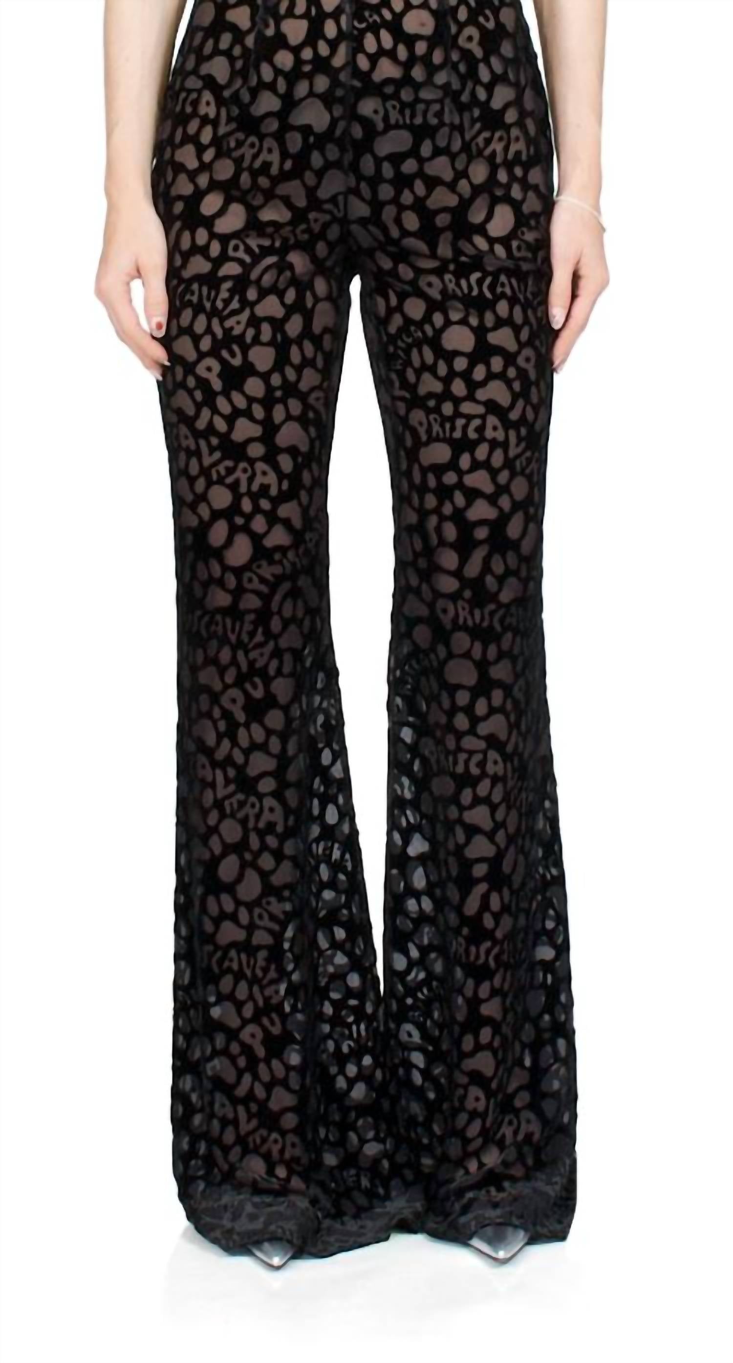 Elevate your wardrobe with PRISCAVera's PV Paws Fitted Flared Pants, crafted from a luxurious semi-sheer velvet burnout fabric. These black, high-rise pants feature a flared leg for a stylish silhouette, complemented by convenient back pockets. Composition includes 72% viscose and 28% silk, offering a sophisticated, lightweight feel. Closure: Invisible side zipper.