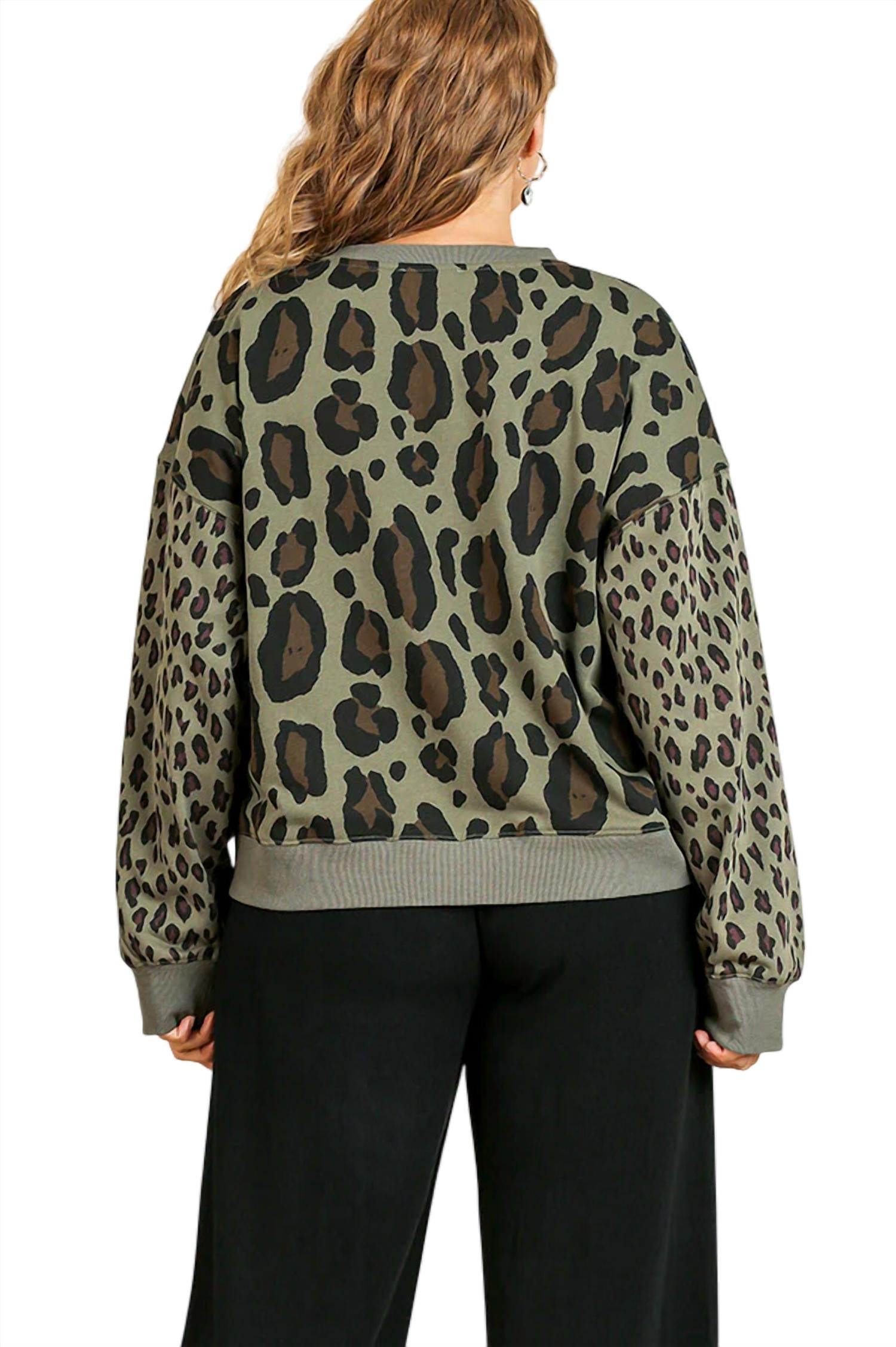 It features a fun leopard print. Round neckline. Long sleeves. Dropped shoulders. Ribbed band at the hem. Full cut relaxed silhouette. Made of light to medium weight cotton. Small bust 46" length 23". Medium bust 48" length 23". Large bust 50" length 23". XL bust 52" length 25". 1X bust 54" length 25". 2X bust 56" length 25". 100% cotton. Imported. Hand wash cold.