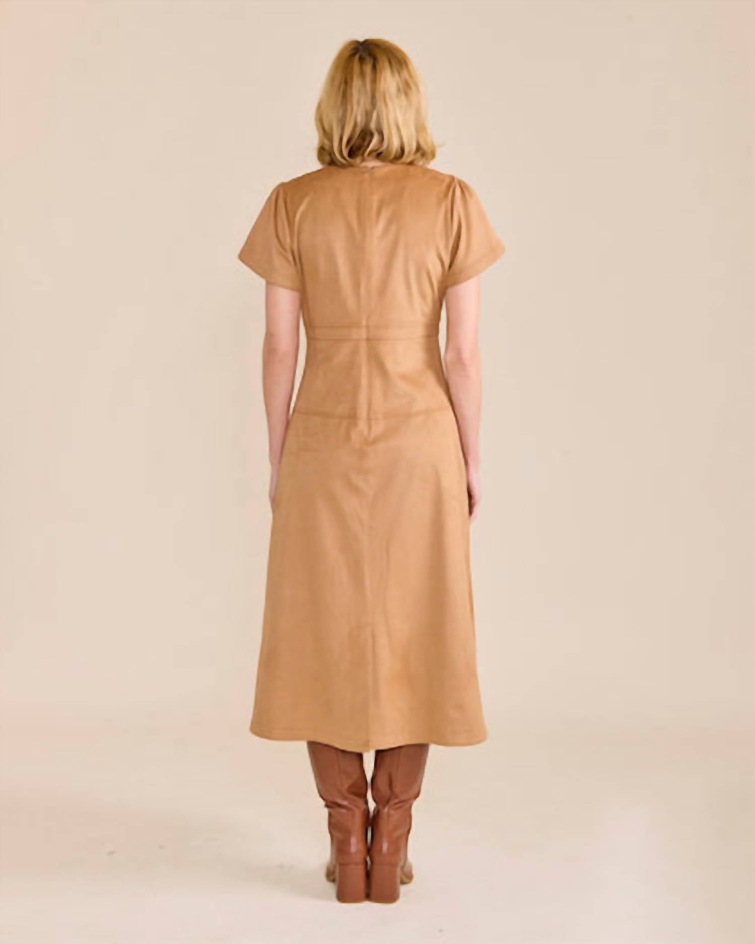 A midi dress so versatile, your options for wearing it are endless. This midi-length dress, measuring 46 inches, features a flattering V-neckline and an empire waist, crafted from a blend of 90% polyester and 10% spandex with a soft faux suede texture. Its short sleeves and micro stripes add a subtle detail, while the back zipper closure ensures a perfect fit.