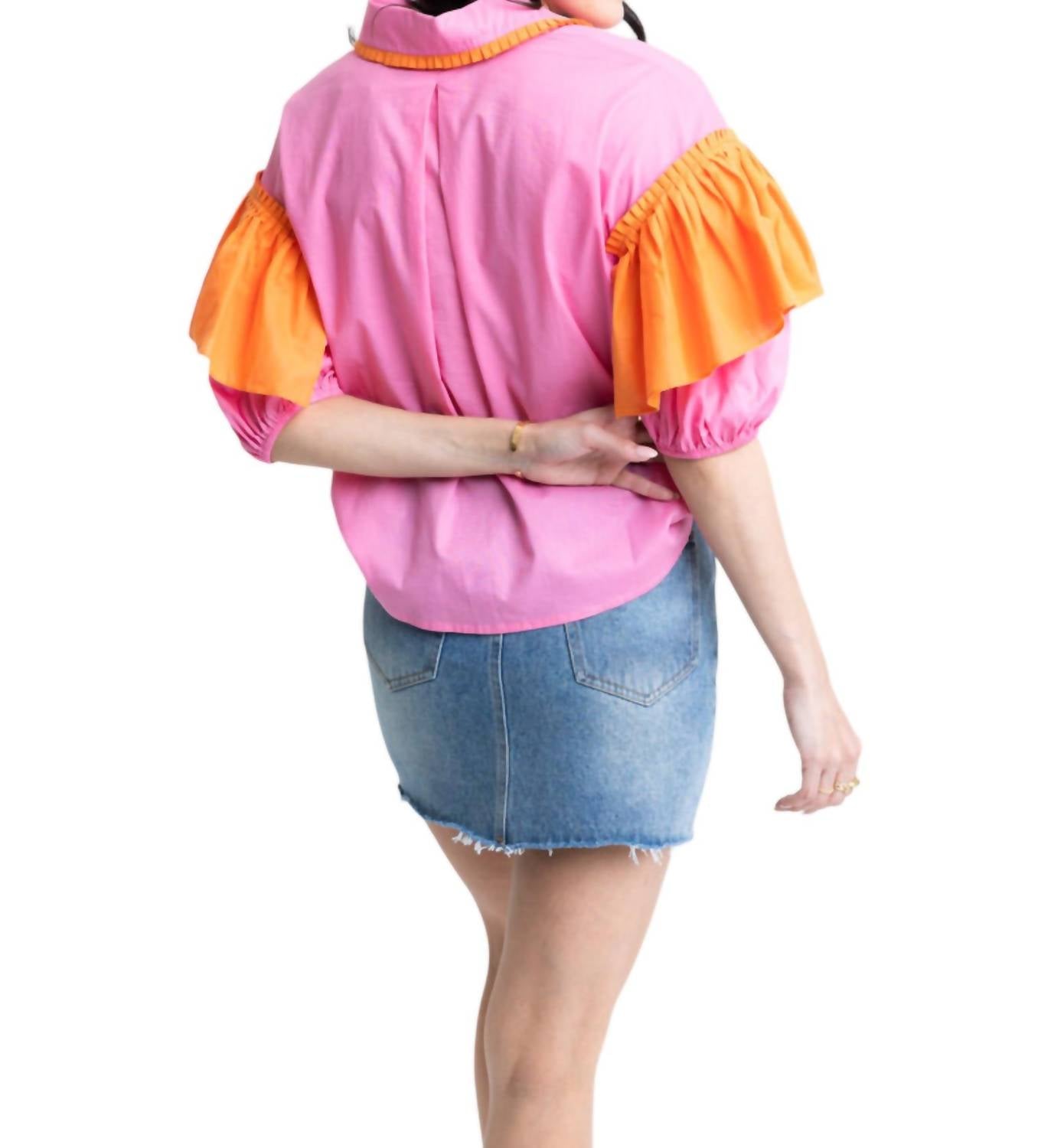 Introducing the Ruffle Colorblock Sleeve Top by Karlie in a striking bubblegum hue, perfect for adding a pop of color to your wardrobe. This blouse features trendy color block design and stylish elbow-length ruffle sleeves, enhanced by contrast buttons for a unique touch. Composition: Polyester. Closure: Button closure.