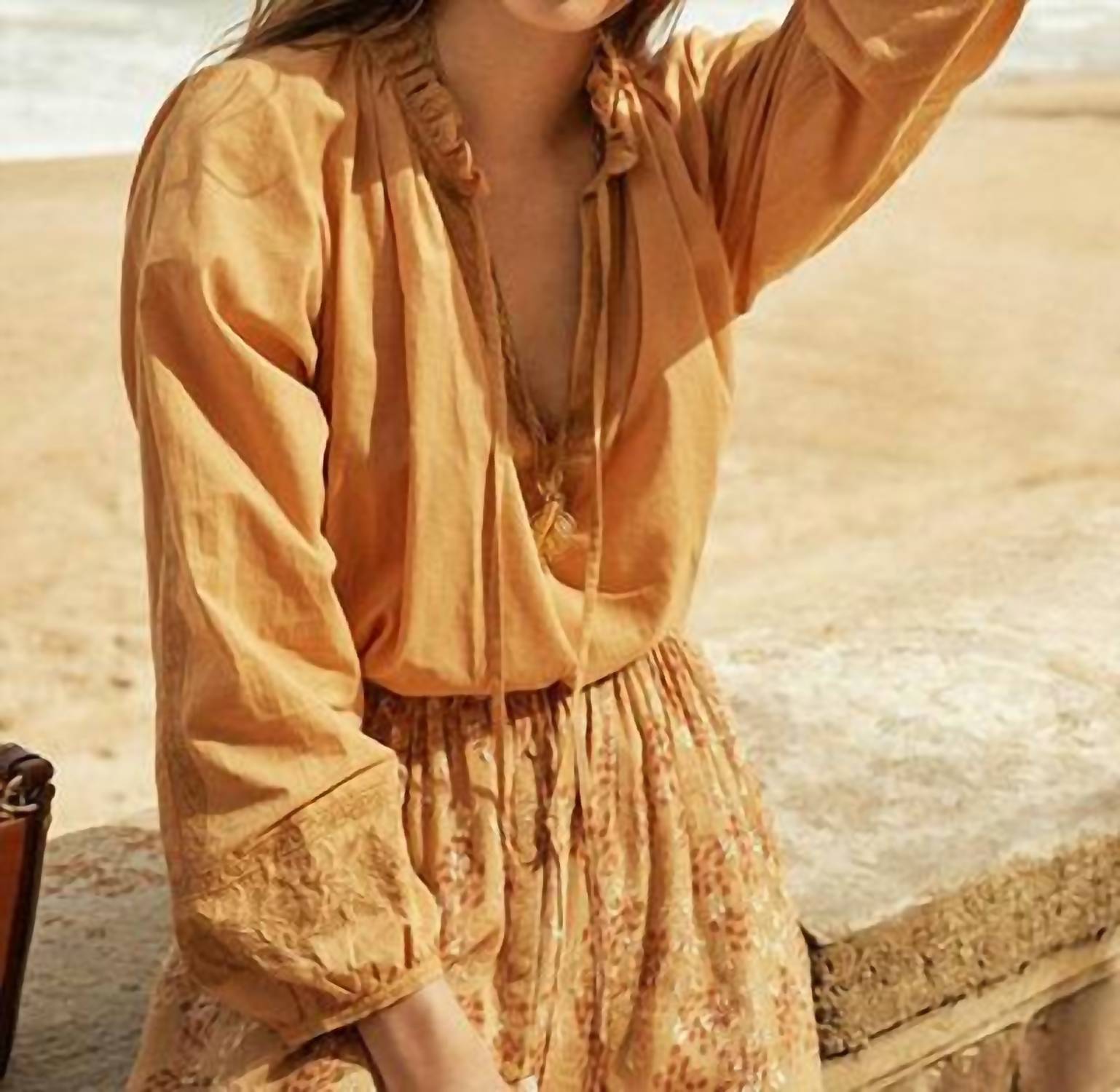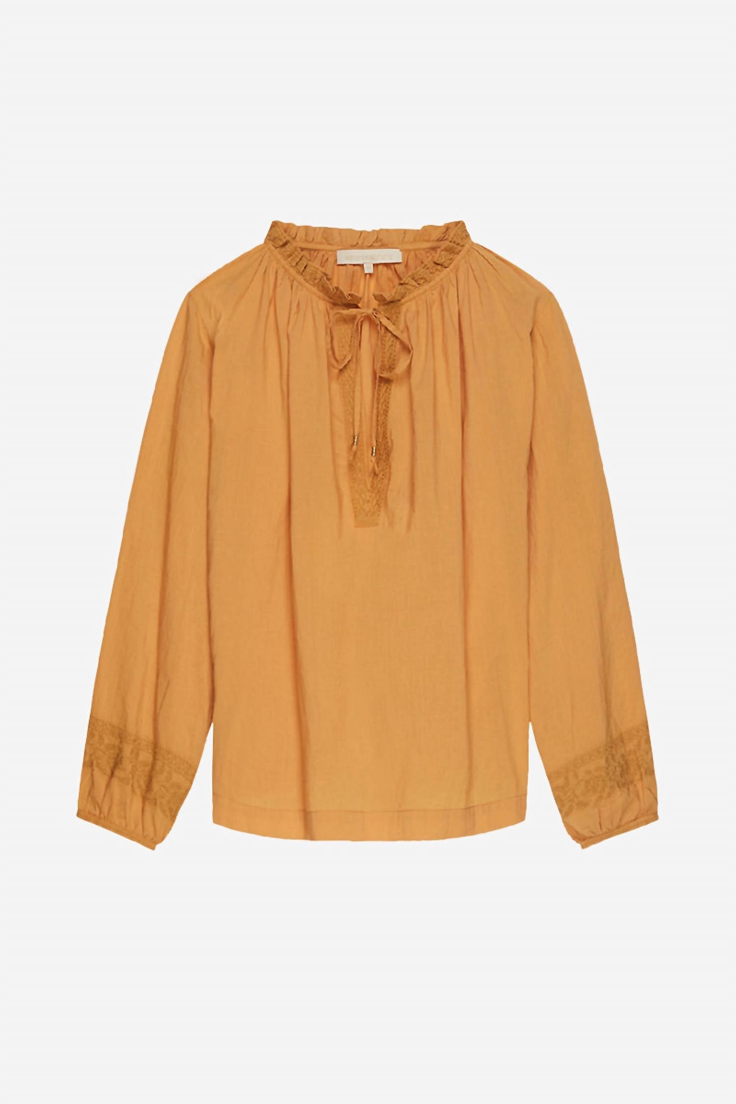 A timeless blouse that will never go out of style. The Vadim Blouse by vanessabruno effortlessly blends bohemian charm with elegant detailing in a vibrant mustard hue. Crafted from 100% cotton, this blouse features long buttoned sleeves and showcases exquisite embroidery along the V-neck, collar, cuffs, and sleeve edges. For a truly unique touch, it includes a gathered collar accented with ties and pearl bead details. Closure: Pull-on style, with dimensions available in French sizing.