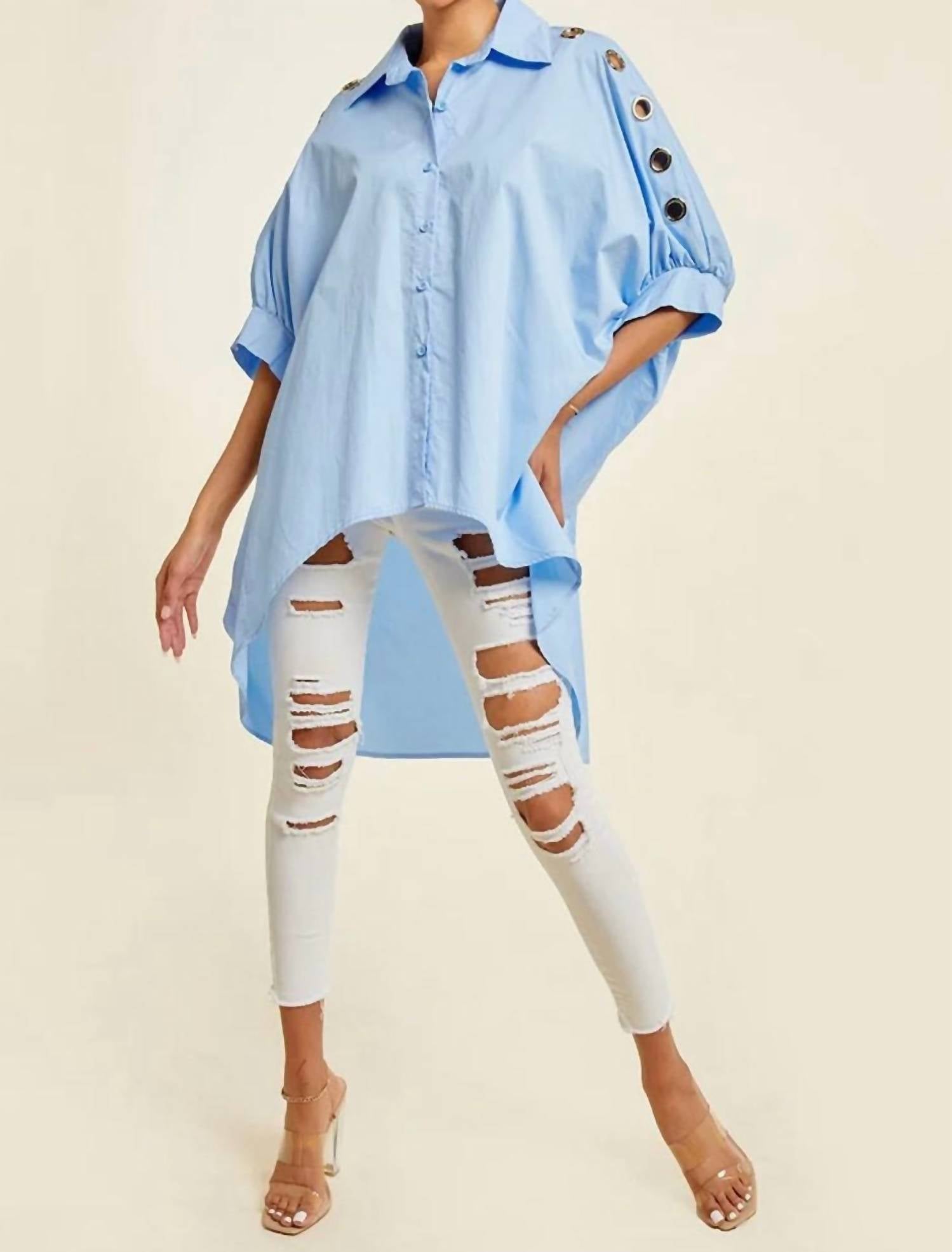 A classic button down shirt that will never go out of style. Elevate your wardrobe with the Skyline Statement Button-Up Shirt by QMP Moda, a standout piece in a soft sky blue that effortlessly combines edge and chic style. This women’s shirt features three-quarter sleeves and a structured collar, complemented by bold grommet detailing. Made in an oversized silhouette with a dramatic high-low hem, it adds volume and versatility to any summer look. Closure type: Button closure.