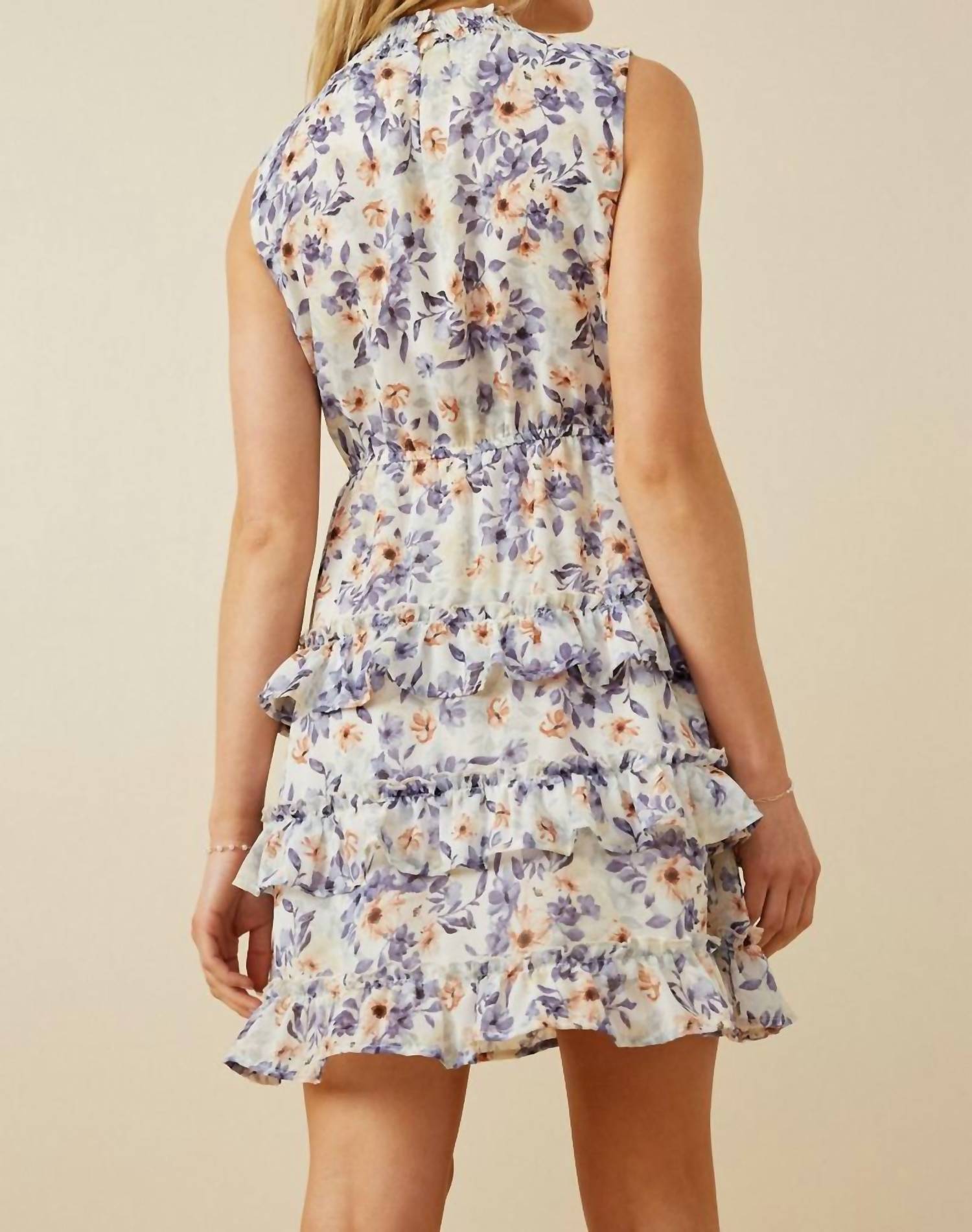 The kind of easy and flattering dress you'll be reaching for all season long. Elevate your spring wardrobe with the Floral Smocked Neck Tiered Dress by Hayden LA, a vibrant choice for Easter and vacation occasions. This sleeveless mini dress, rendered in a stunning ivory and lavender floral print, features a smocked crewneck with button closure and practical side pockets. It's crafted from 100% polyester and fully lined for a comfortable fit. For care, hand wash and line dry to maintain its beautiful A-line silhouette, perfect for embracing the maximalist trend.