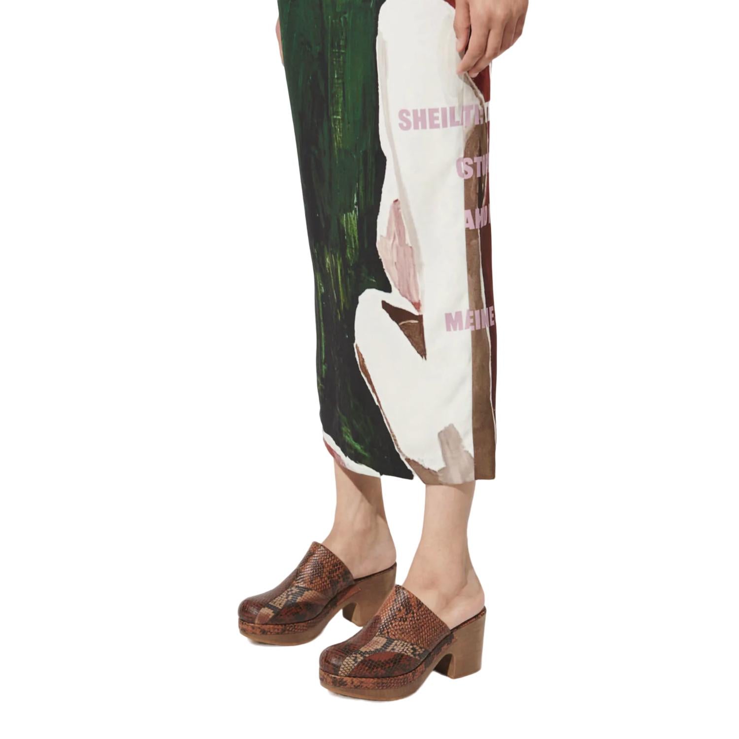 Classic closed-toe clog with a chunky carved wood platform. 100% snake print leather upper, 100% wood base. 100% rubber sole with a heel cap. 70mm heel, 30mm platform. Go up half a size for mid to wide feet; fits true to size for narrow feet. Made in Peru.