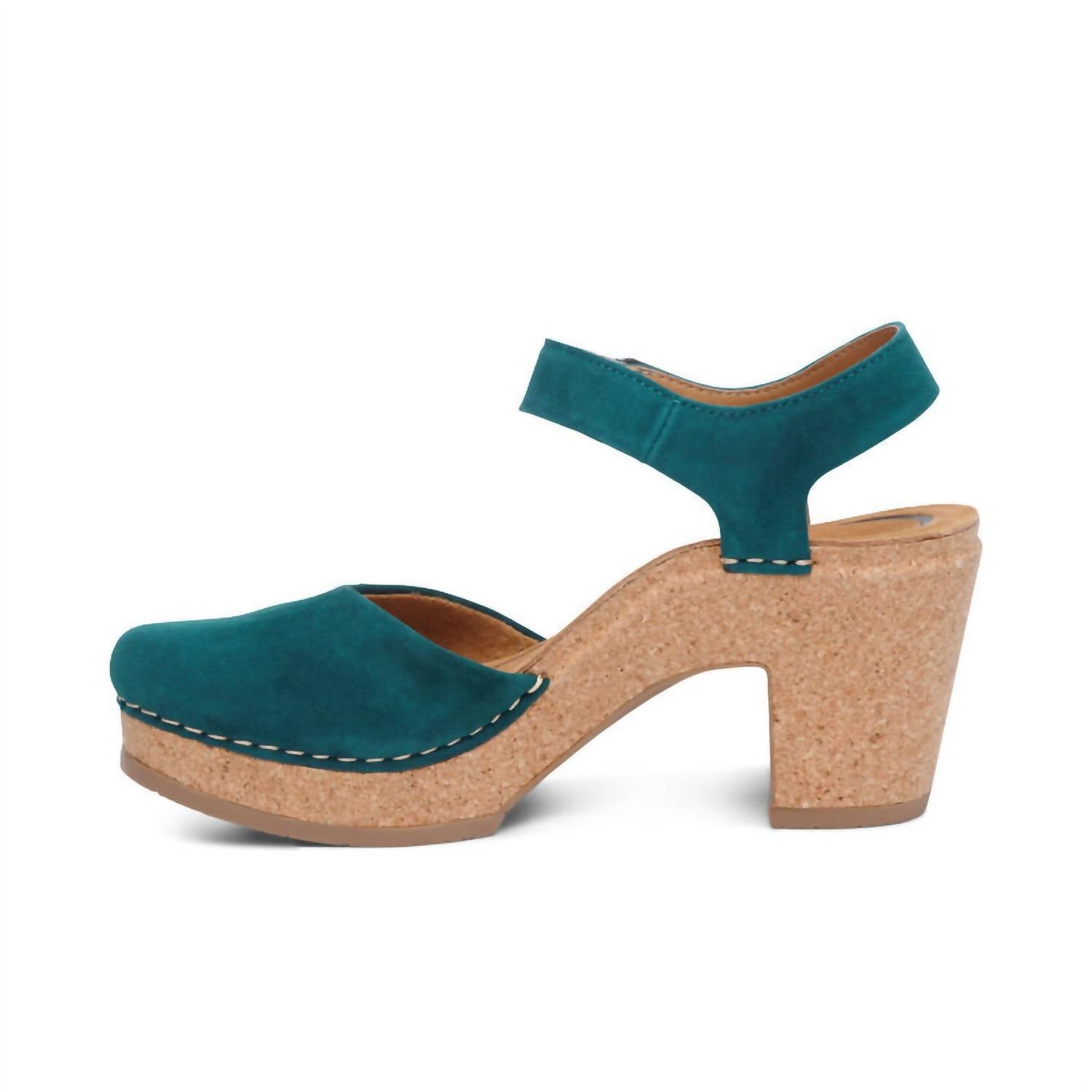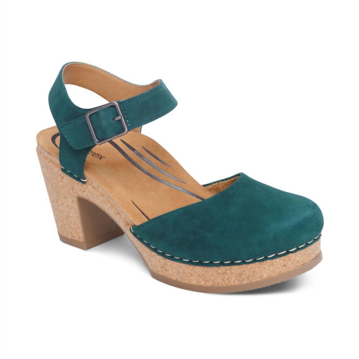 Classicly cute and all-day-wearable. We love this sandal. Step into spring with the Women's Finley Sandal by Aetrex, perfect for your next vacation or St. Patrick's Day celebration. Crafted in a boho chic style, these dark teal sandals feature a comfortable mid block heel, ranging between 2 1/4" and 3" in height. Designed with a classic round toe, they offer a trendy yet practical choice for any occasion. Ideal for women seeking both style and comfort during the vibrant spring season.