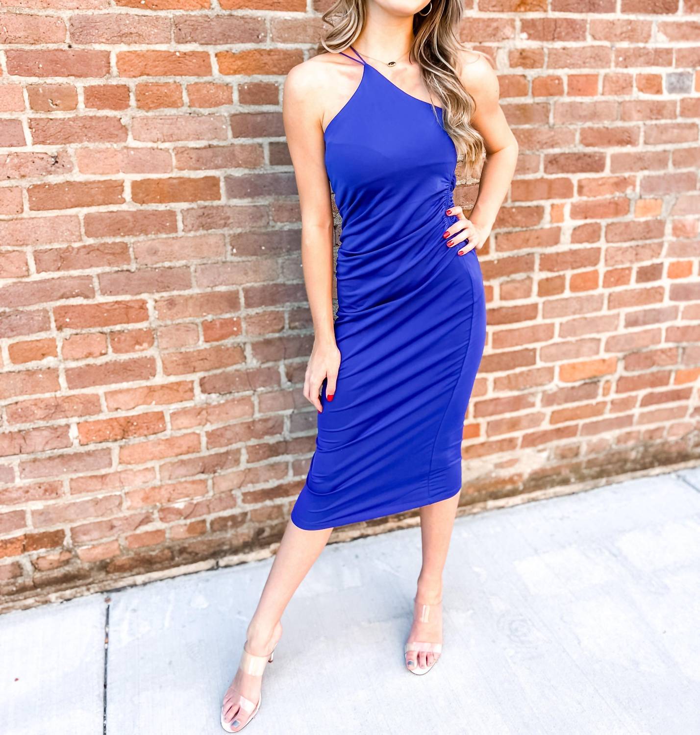 Description: Slinky stretch dress in Royal Blue with side ruching, side double one shoulder straps. Fit: Fitted, true to size