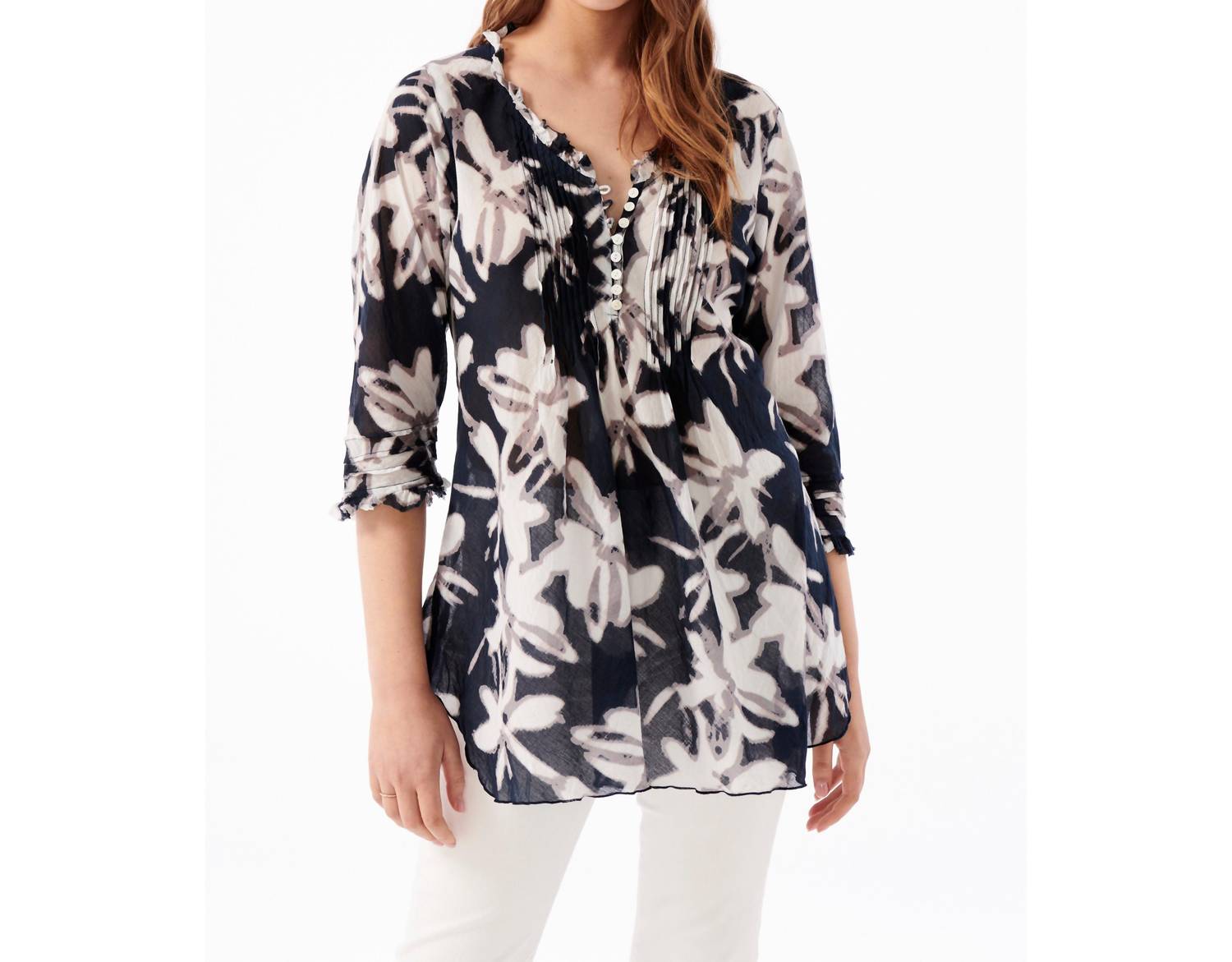 Big Sur Cotton Poppy Top by Oneseason. Relaxed timeless piece. Comfort and vibrant style. Navy top. Crafted in India. Fabulous print patterns. Lightweight feminine silhouette. Hand wash with mild detergent.