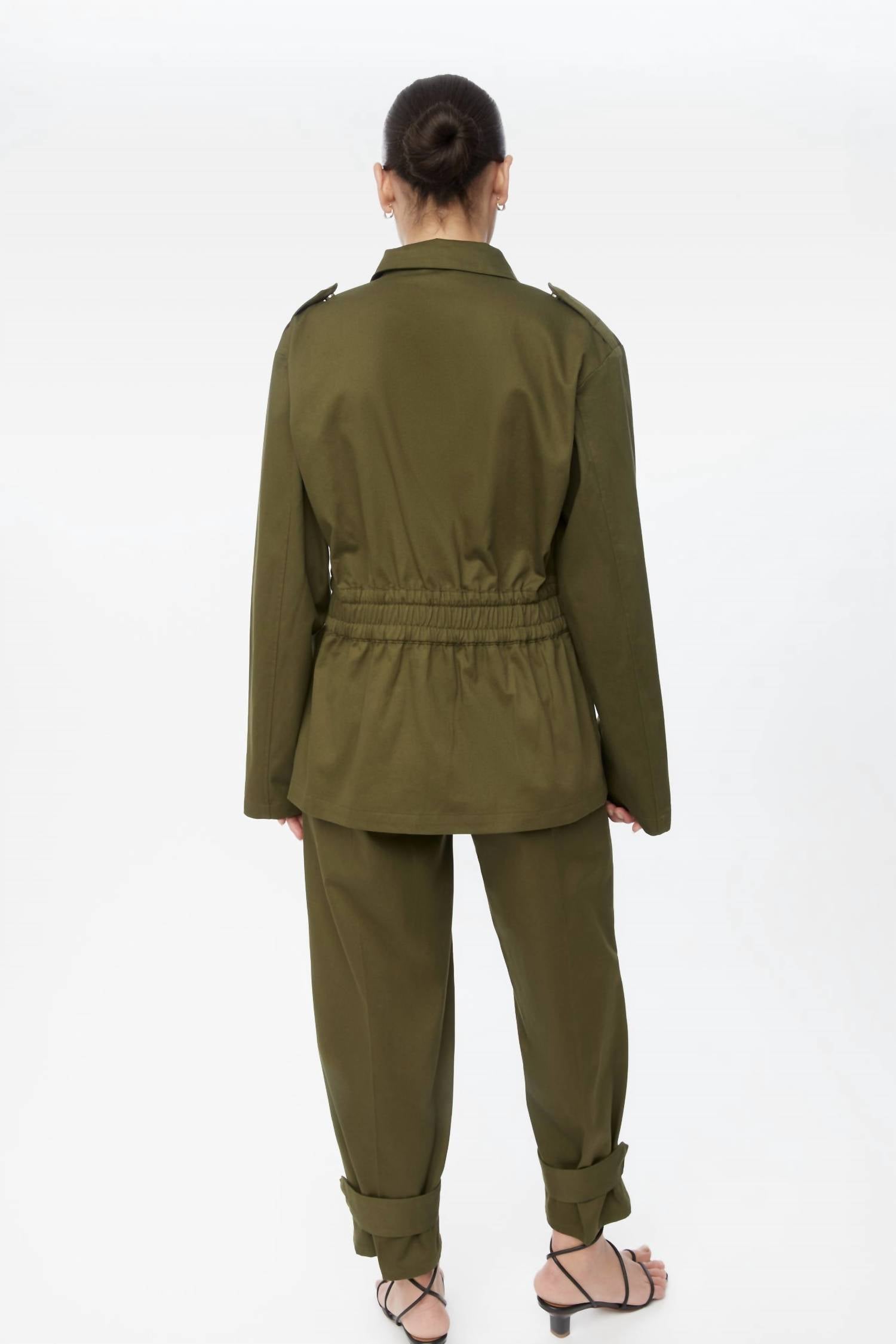 The ultimate cool-girl utility jacket. Introducing the Canvas Cotton Utility Jacket by Dāl the Label in a chic olive hue, designed for the modern woman who values both style and utility. This long-sleeve jacket features a supportive structure with a point collar, front flap pockets, and a bell sleeve silhouette. Crafted from pure cotton, it includes an adjustable tie cotton rope at the waist and a discreet snap front closure for a seamless finish. Care instructions recommend hand washing and tumble drying to maintain its quality.