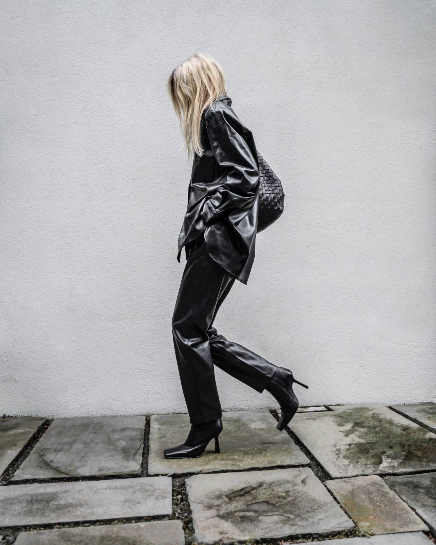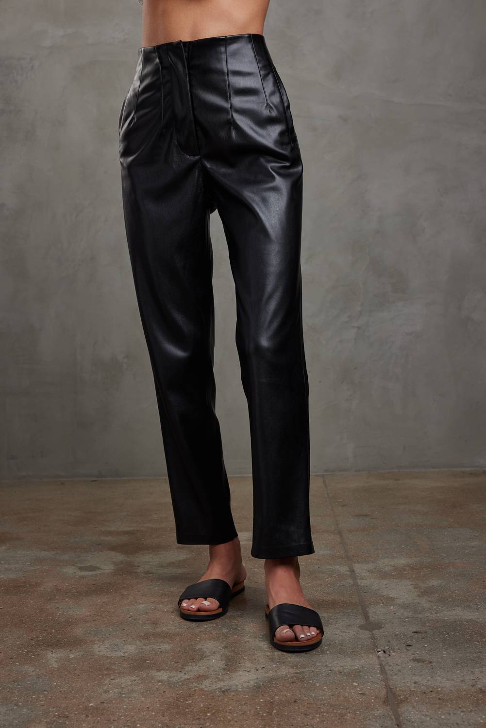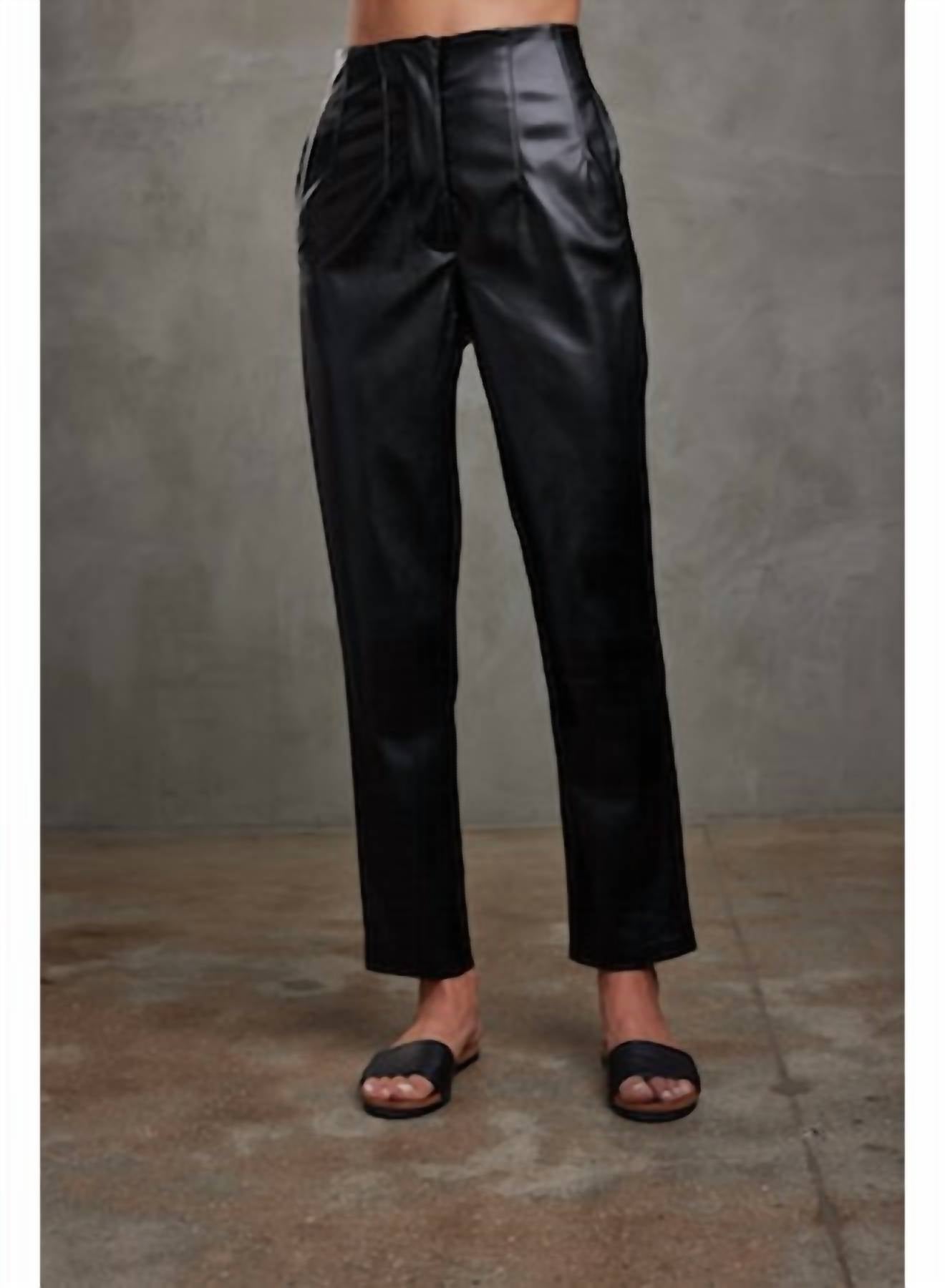 Our best-selling Keaton pants are back! Featuring topstitched pleat details and a tailored fit with front welt pockets, these pants can be dressed up or down for any occasion. Made in our signature vegan leather, these are the perfect slim-fit vegan leather trousers for fall. Keaton is true to size. Size small measurements: Waist: 14". Inseam: 27 1/2". Model is wearing a size small. 100% PU Vegan Leather. Machine wash cold with like colors, tumble dry low.