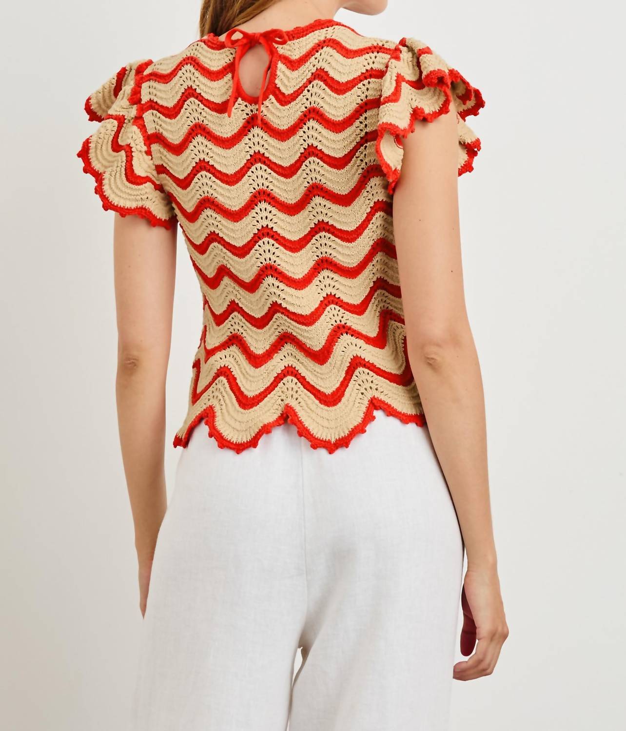 Pair this with your favorite jeans and slides for your next girls night out. The Rails Coen Top in Cherry Oat Stripe is a charming addition to your summer wardrobe. Featuring cap sleeves and crafted from a cotton blend composed of 60% cotton and 40% acrylic, this top is designed for comfort and elegance. It boasts a crewneck with delicate eyelet details and a scalloped edging, complemented by a keyhole opening and adjustable tie closure for a personalized fit. Care instructions advise hand washing and laying flat to dry, ensuring the top maintains its quality appearance.