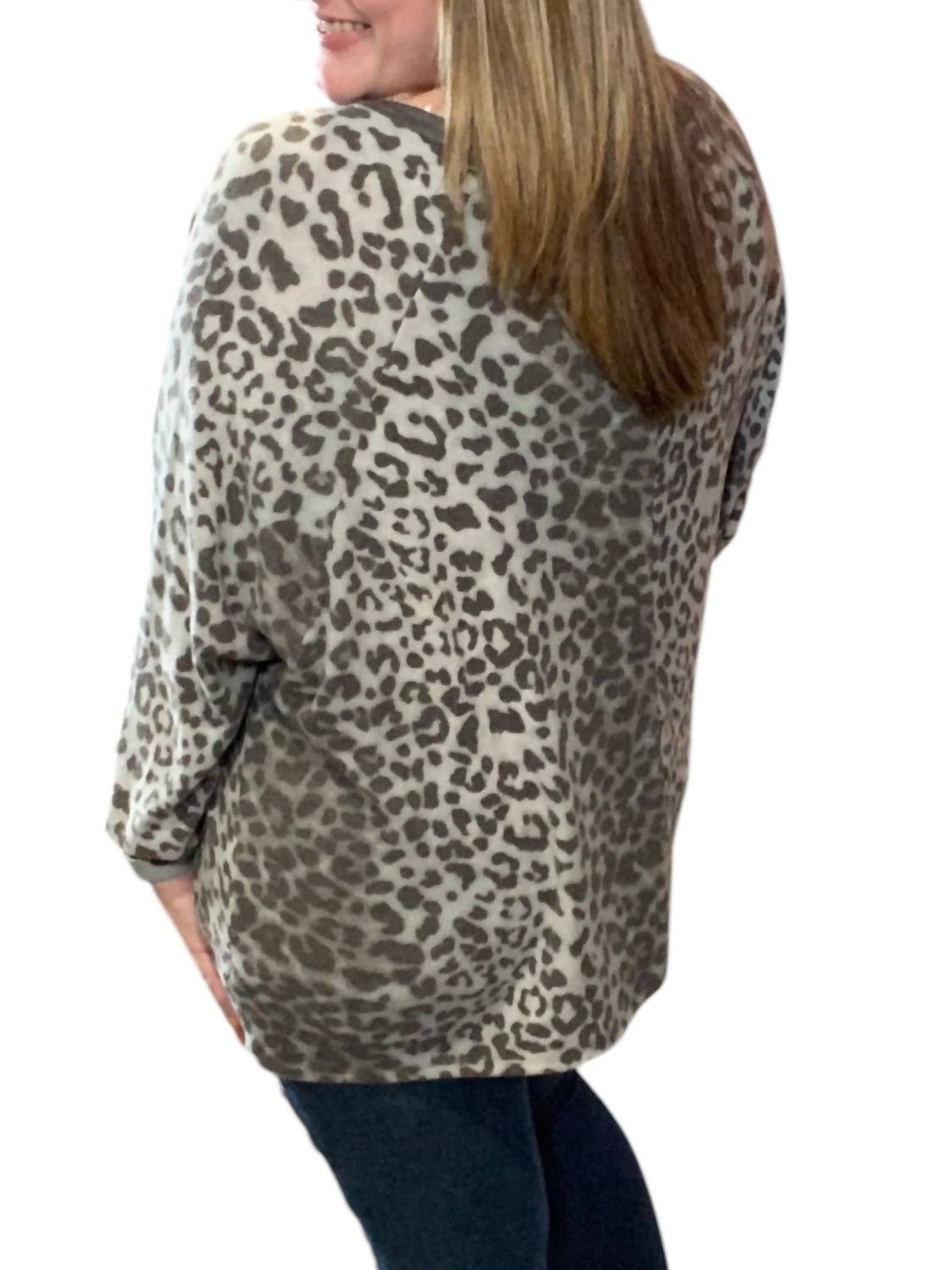 Long sleeves. Scoop neckline. Animal print. Oversized. 78% Polyester 18% Rayon 4% Spandex. Machine wash cold.