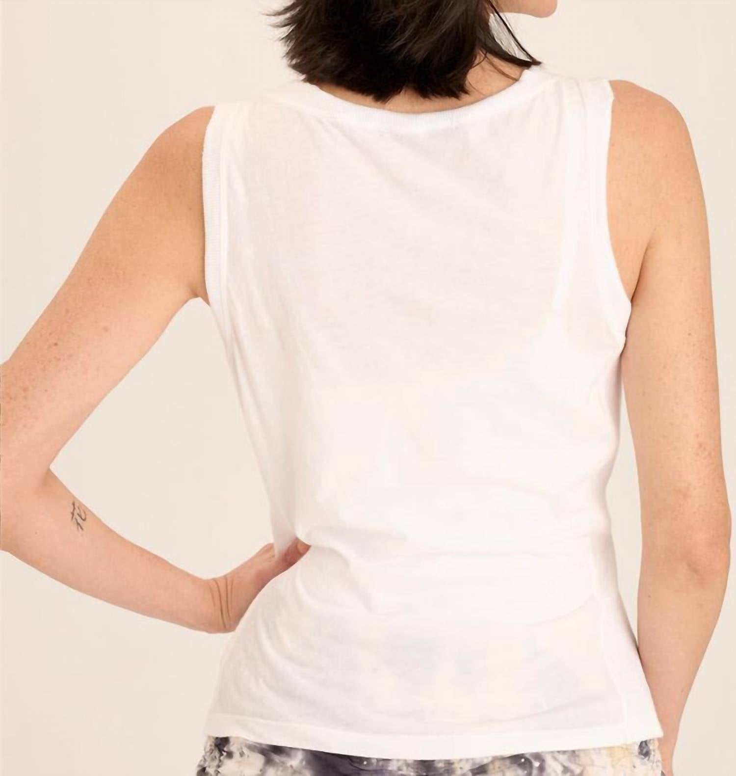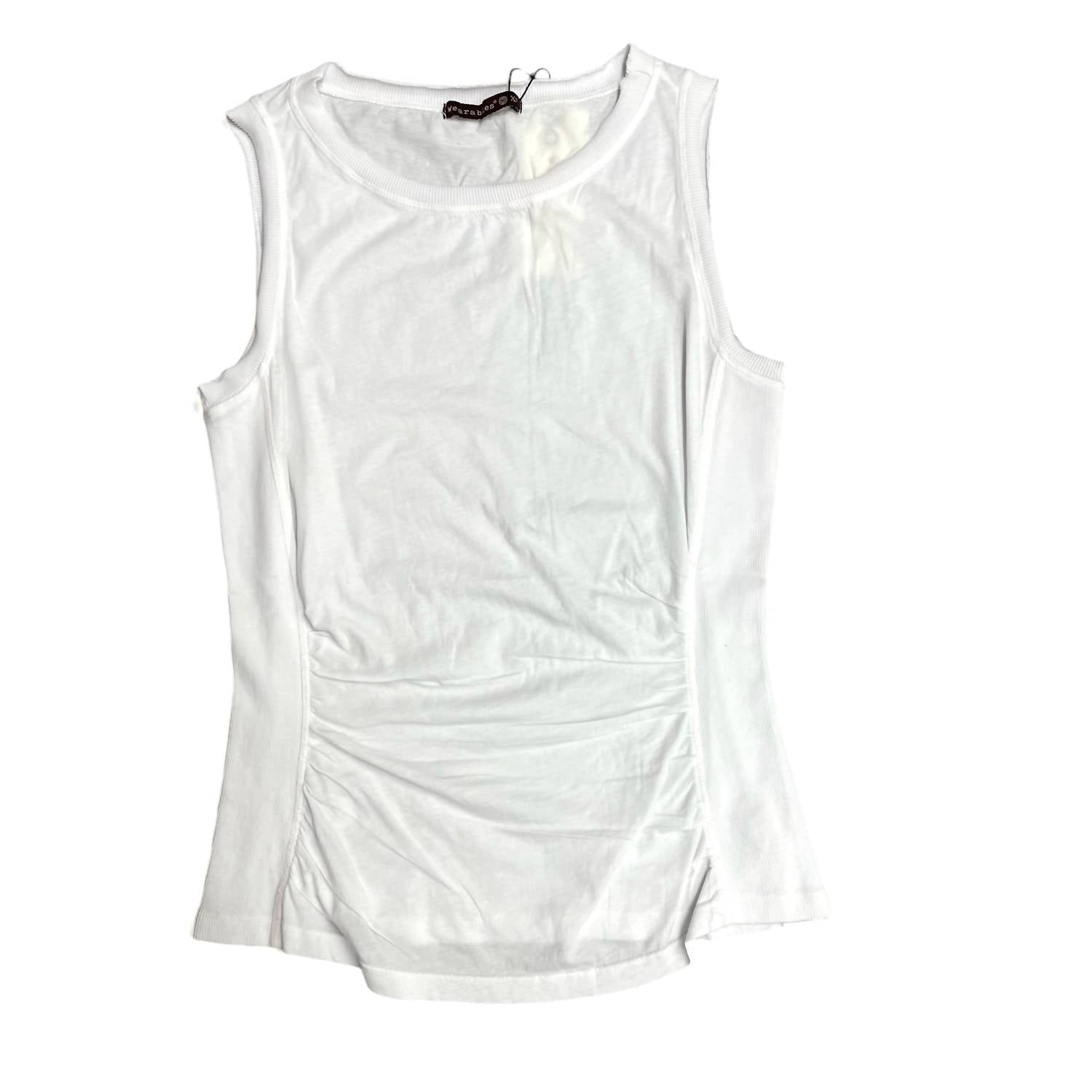 This classic tank top is perfect for layering and cute enough to wear on its own. Elevate your wardrobe with the Rexel Jersey Rib Insert Shirred Tank by XCVI, a perfect blend of style and comfort for women. This sleeveless tank in a classic white features a crewneck design and boasts rib side panels with a shirred body for a fun, modern twist. Crafted from Abbott Jersey: 100% Cotton with 2x1 rib inserts made from a 95/5 cotton/spandex blend, it measures approximately 21" at the center front and 22.5" at the center back. Originating from a solid pattern, it is preshrunk and machine washable, ensuring easy maintenance while providing a comfortable pull-on closure.