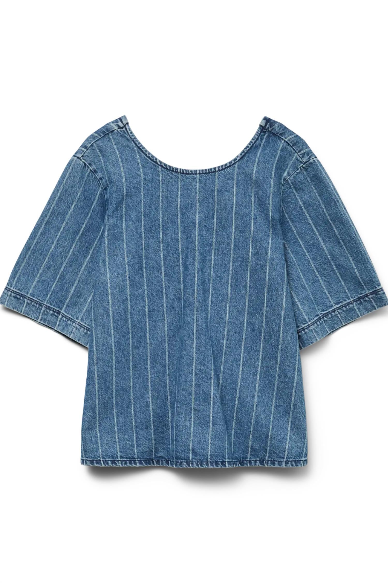A versatile blouse that works from desk to dinner! Meet the Striped Tie Blouse by VERO MODA, an effortlessly cool piece with a feminine twist. This short sleeve denim top is crafted from 100% cotton with delicate bleach pinstripes and features a bow tie closure at the back for a playful touch. The flattering A-line silhouette adds a modern edge to your style, and it can be styled with the bows in the front for versatility. Care is easy with machine wash instructions.
