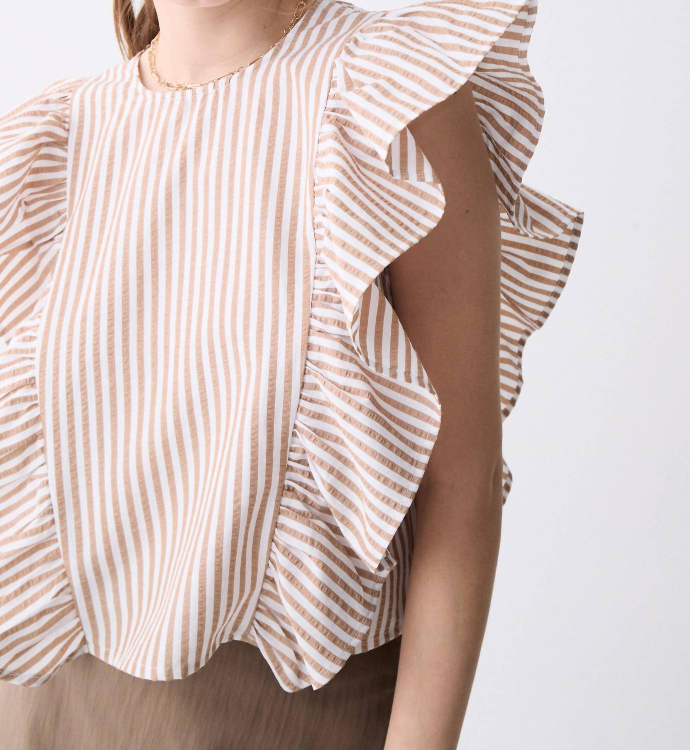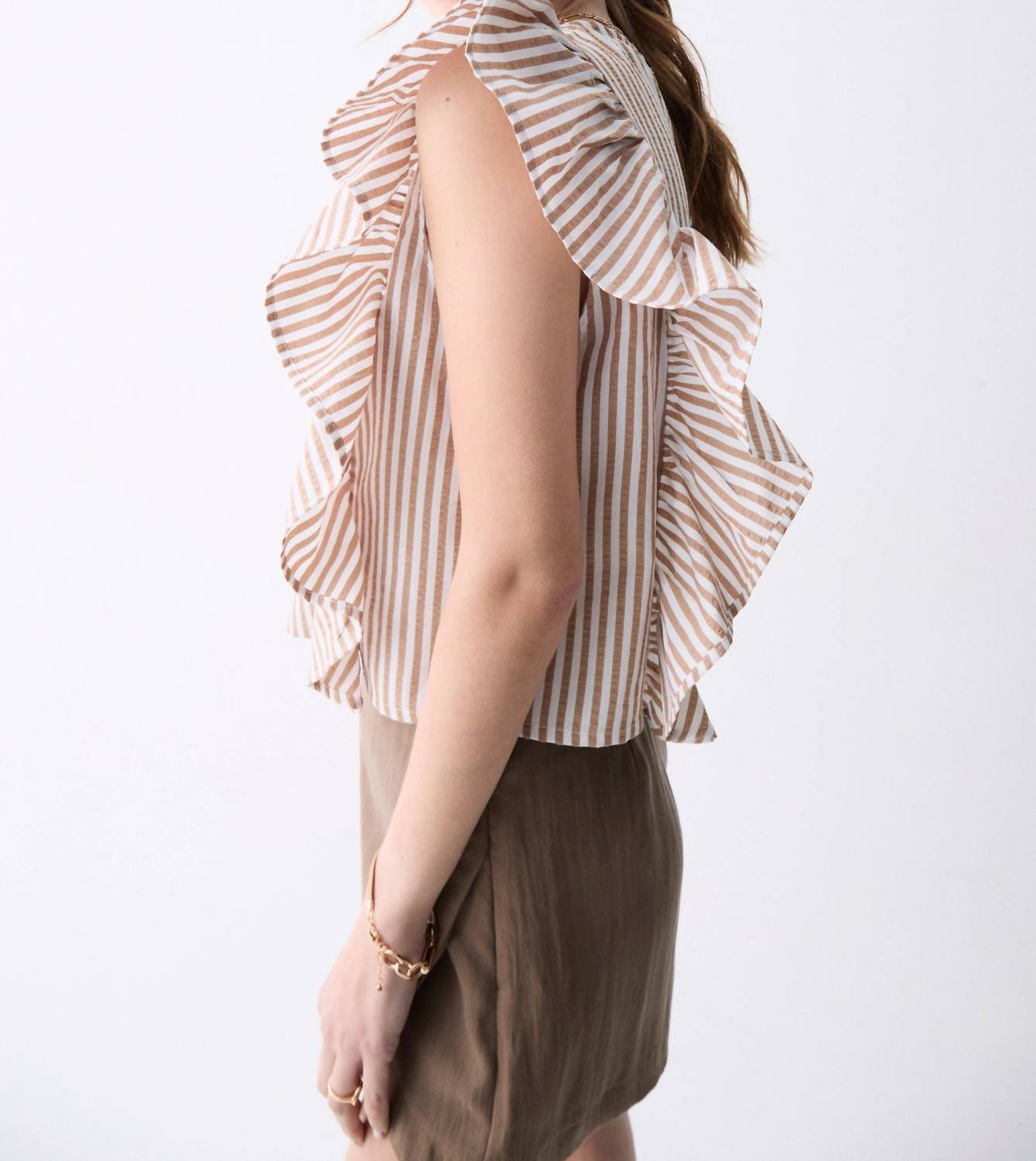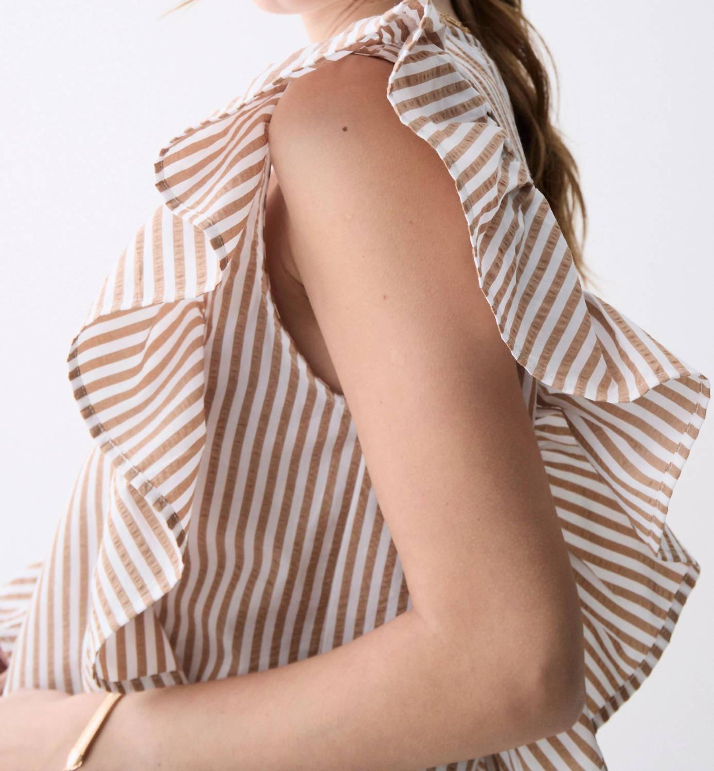 Pair this with your favorite jeans and slides for your next girls night out. Elevate your style with the DELUC Cesar Top, a timeless piece in striped tan that adds a touch of sophistication to any wardrobe. This gingham blouse is crafted from a comfortable cotton blend, featuring cap sleeves and a chic crewneck. The ruffled sides on both the front and back enhance its feminine flair, complete with a delicate button closure at the back neck. For optimum care, hand wash and lay flat to dry. Model measures 5'9" and wears a size S.