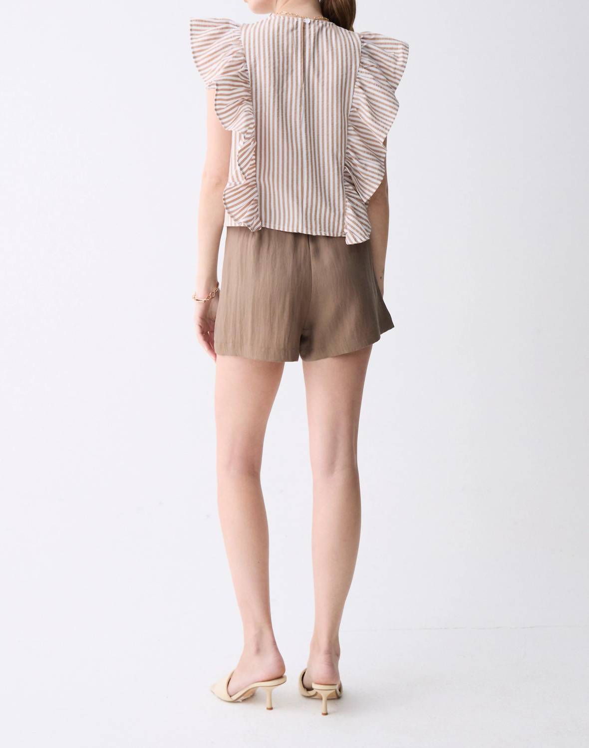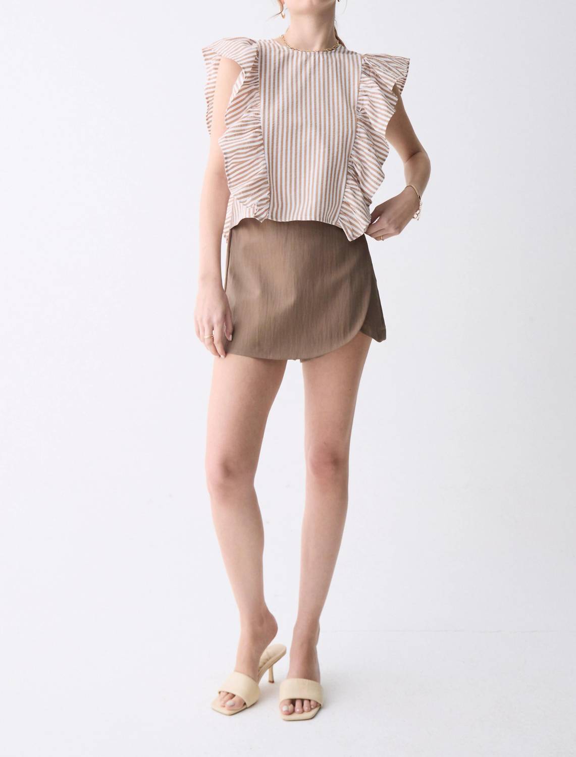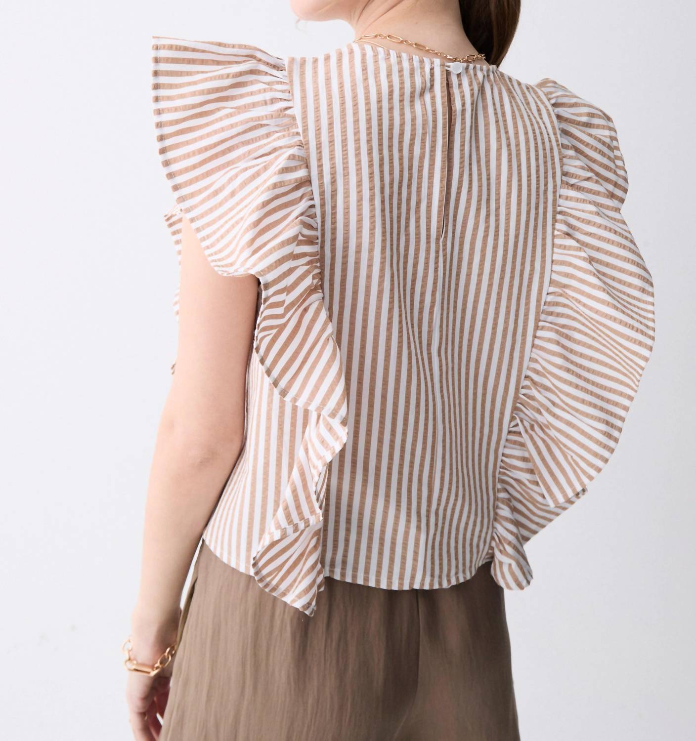 Pair this with your favorite jeans and slides for your next girls night out. Elevate your style with the DELUC Cesar Top, a timeless piece in striped tan that adds a touch of sophistication to any wardrobe. This gingham blouse is crafted from a comfortable cotton blend, featuring cap sleeves and a chic crewneck. The ruffled sides on both the front and back enhance its feminine flair, complete with a delicate button closure at the back neck. For optimum care, hand wash and lay flat to dry. Model measures 5'9" and wears a size S.