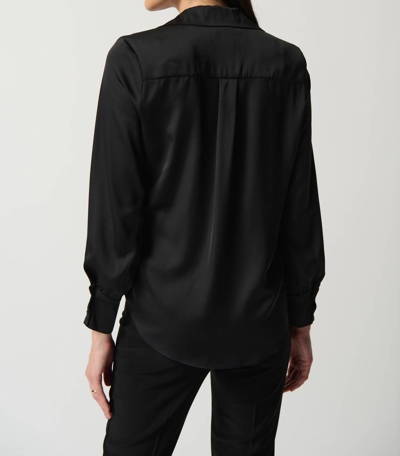 Chic long-sleeved blouse. Crafted from 100% polyester in luxurious satin. Featuring a sophisticated notched collar and subtle cuffs for added elegance. Closure is a sleek pull-on style. Perfect for seamless dressing. Easy to maintain, simply hand wash in cold water and let it hang to dry in the shade.
