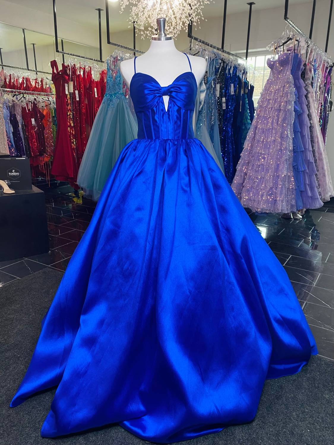 Turn heads in the cutest and most flattering evening dress. Striking choice for any formal occasion. Floor-length gown in royal blue features a sweetheart neckline, complemented by delicate spaghetti straps. Crafted from luxurious satin. Boasts a dramatic ballgown silhouette with a classic lace-up corset back for a custom fit. Zip closure. Spot dry clean only. Ideal for prom, this gown epitomizes quiet luxury.