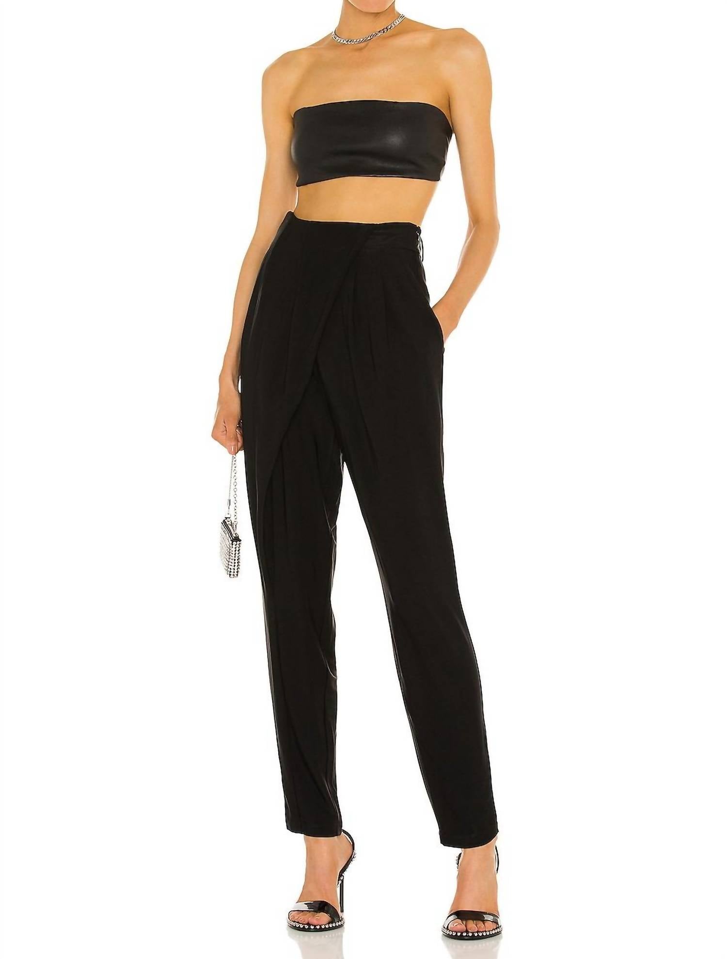 Features a hidden side zipper closure, side seam pockets, and pleated fabric detail. Made from lightweight jersey fabric, it is composed of 95% viscose and 5% spandex. It is dry clean only. The model is 5'10.5" and is wearing a size S. Measurements are an inseam of 30 inches, a rise of 15 inches, and a leg opening of 11 inches.