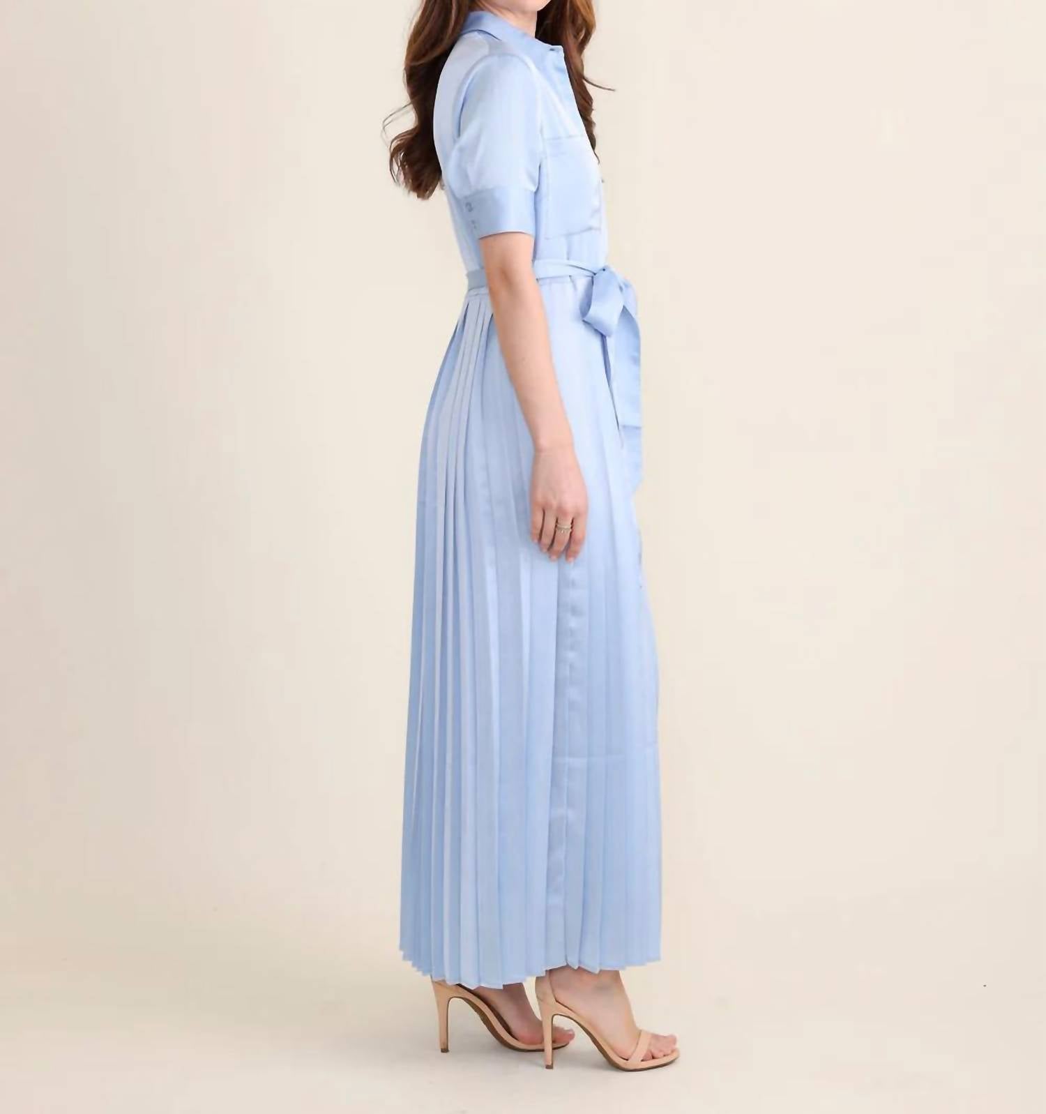 A maxi dress that is just as cute as it is comfortable. Meet the Beckett Dress by Sedge, a stunning addition to your spring wardrobe in a delightful Cornflower hue. This elegant maxi dress features elbow sleeves and a pleated A-line silhouette, complete with a collar neckline and practical pockets. Made from high-quality polyester, the dress closes with buttons and comes with a chic belt for added flair. For best results, dry clean and line dry this holiday party essential.