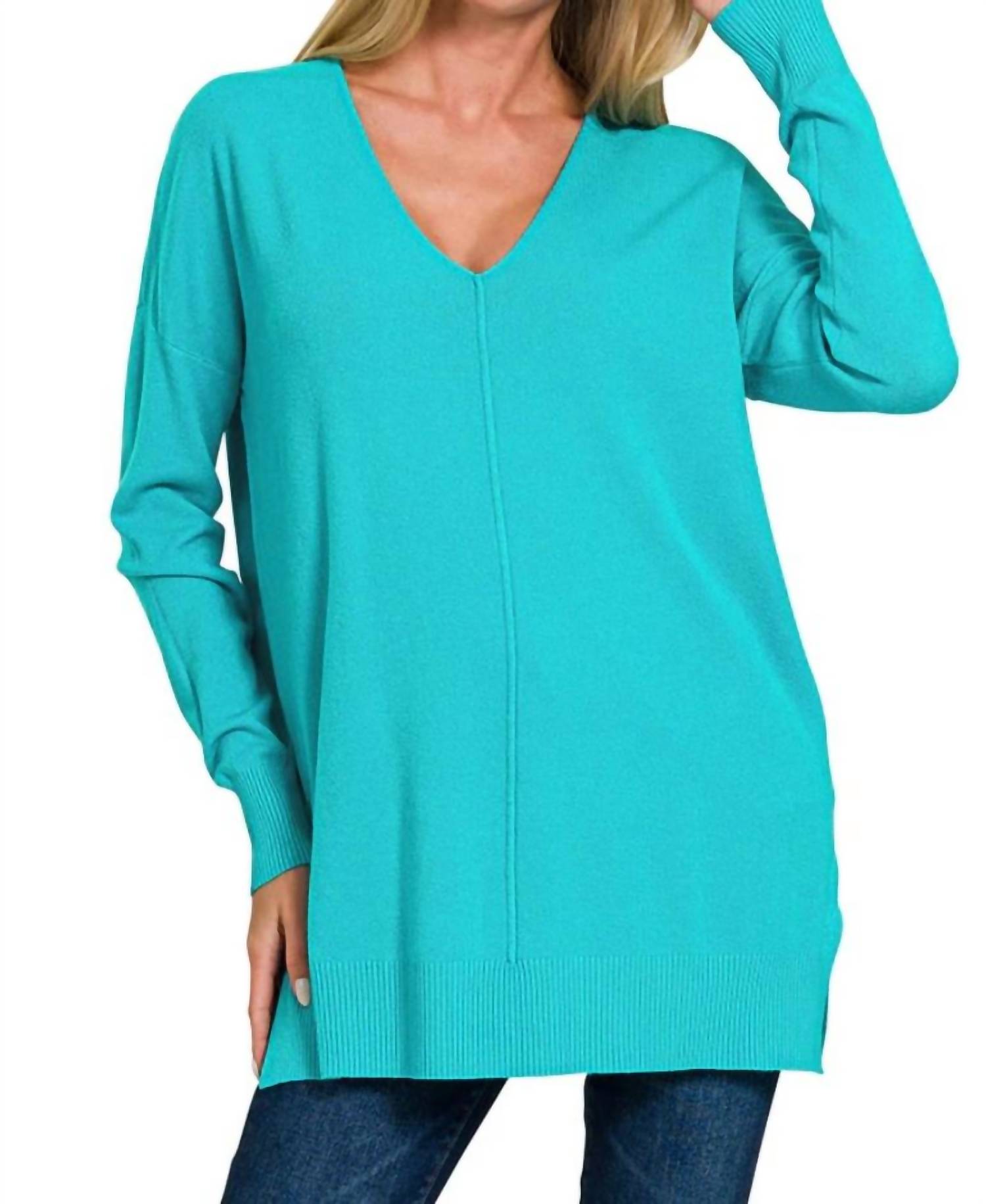 Wear this v-neck sweater with your favorite denim for the perfect fall look. Introducing the Front Seam V-neck Sweater by ZENANA, an essential for any wardrobe with its serene Ice Blue hue. This long sleeve sweater, crafted from soft knit material, boasts a flattering V-neckline and a relaxed silhouette, perfect for travel or Thanksgiving occasions. Closure is simplified with a pull-on design, ensuring effortless wear and styling. Add a cool, calm touch to your fall ensemble without the fuss of complex care instructions.