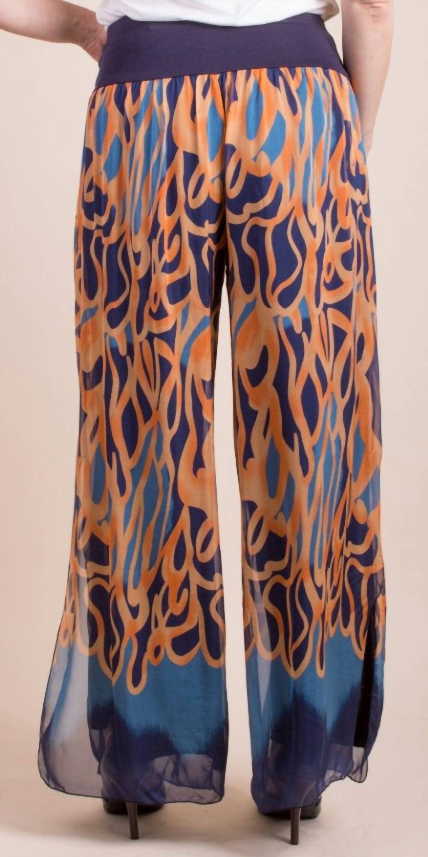 Introducing the Jasmin Turbinio Slit Pant by GIGI MODA, a stylish addition in navy for your vacation wardrobe. These high-rise, wide-leg pants feature an elastic waistband and a trendy side slit at the hem. Crafted in Italy from a luxurious viscose blend with 70% viscose and 30% silk, they offer a boho chic vibe. Designed for easy summer wear, these pants should be hand washed to maintain their quality. Model is 5'8".