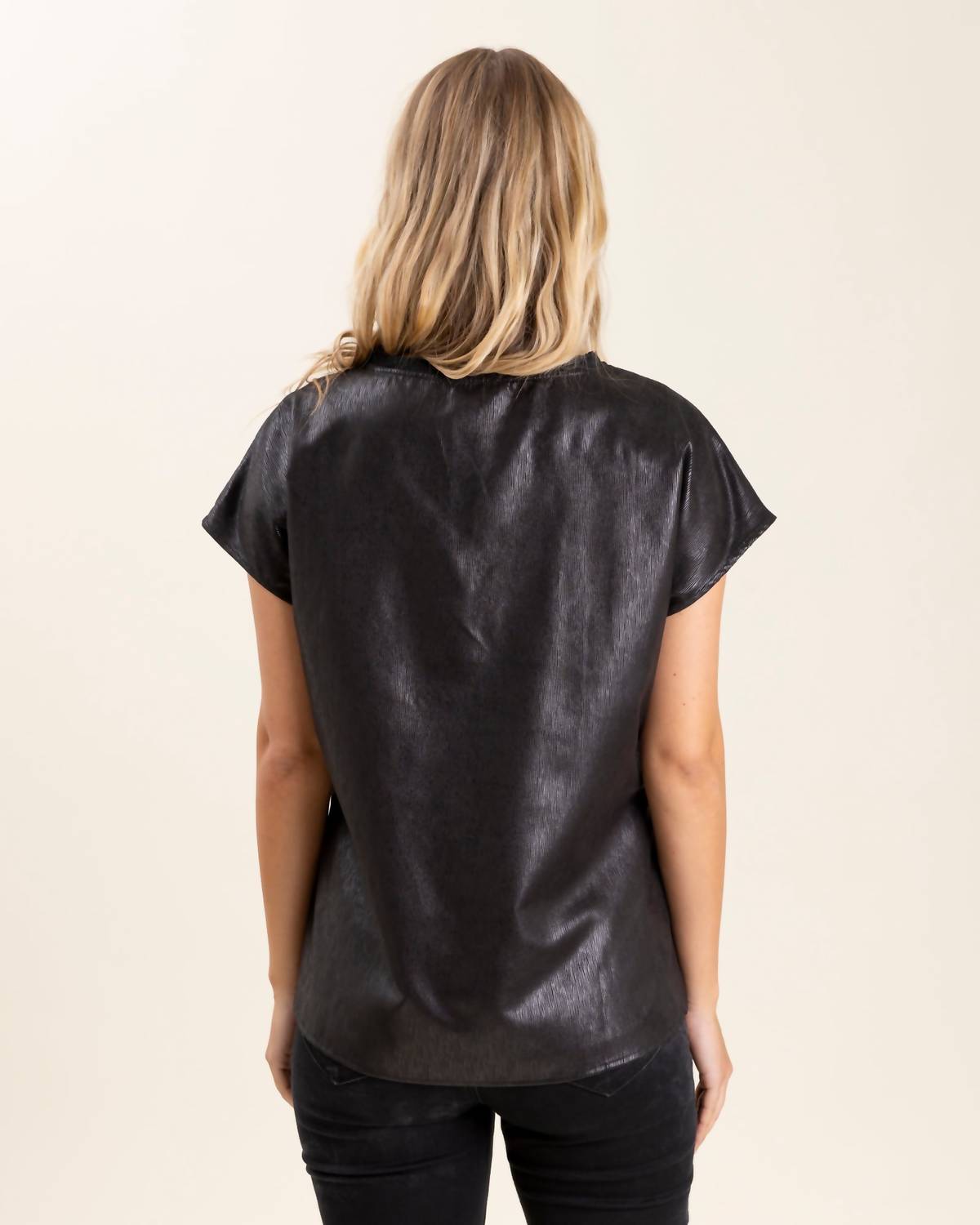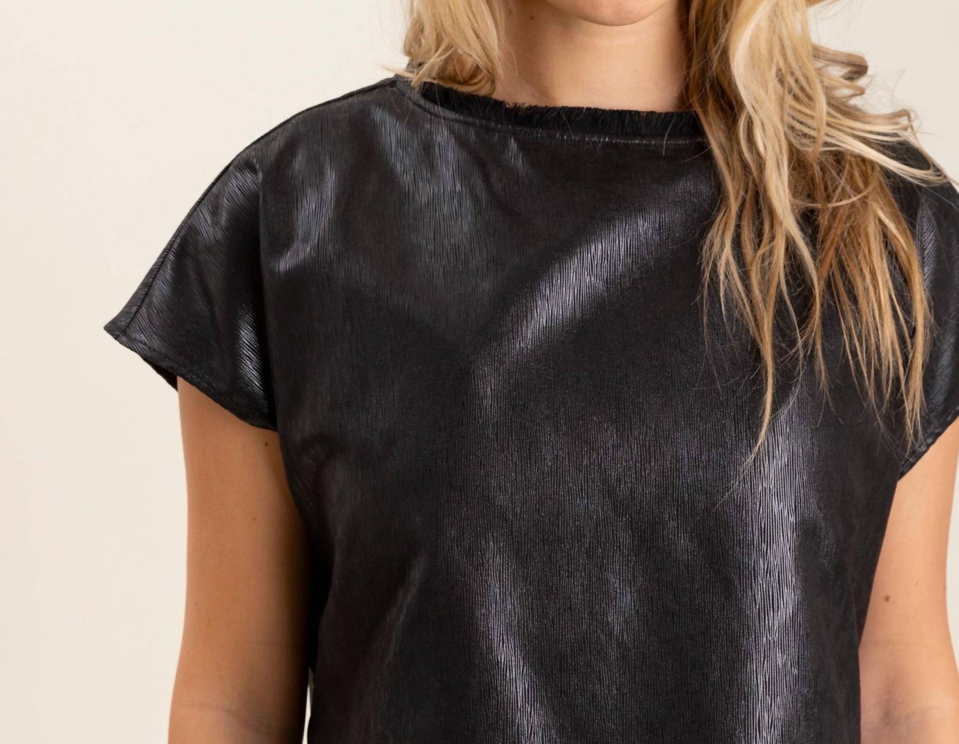 A timeless blouse that will never go out of style. This blouse comes in a solid black with short sleeves and features a stylish scoop neckline. Made from 100% polyester in foil vegan leather, it ensures both comfort and elegance. Pull on. Machine wash cold. Model is wearing a size small. Runs true to size.