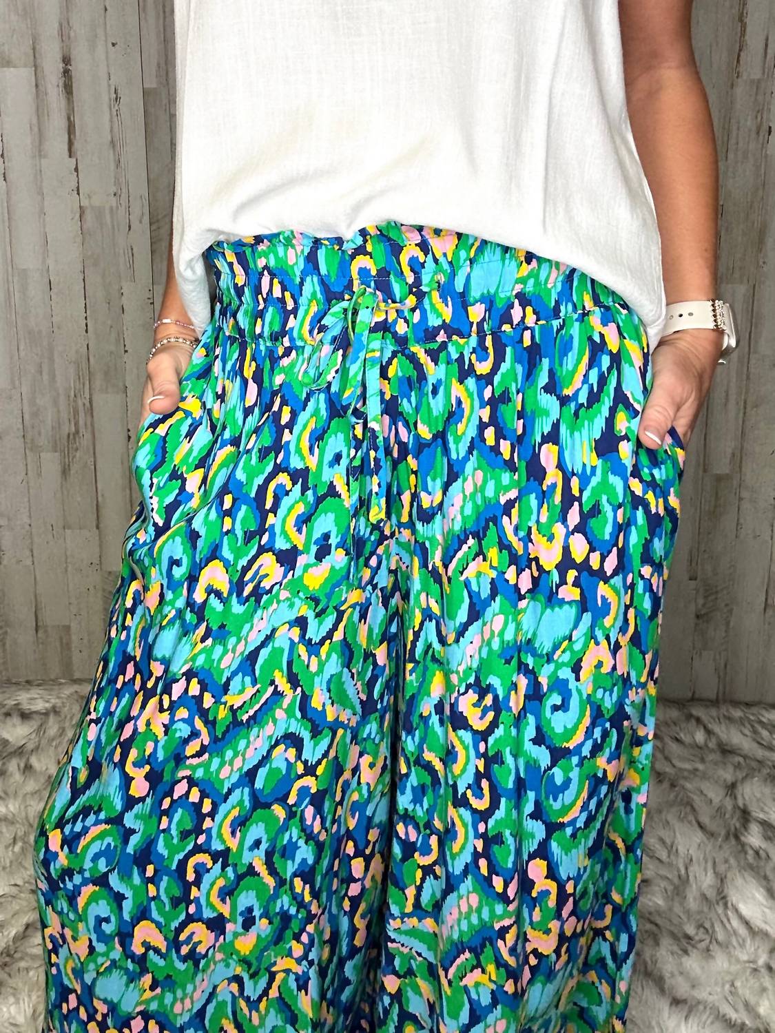Experience the comfort and style of the Armani Beach Wide Leg Pants by Umgee, designed with a stunning mix of blue and mint prints. Crafted from 100% Viscose, these high-waisted pants feature an elastic waistband with a tie for a customizable fit. Made for ease, they close with a simple pull-on design. To maintain their quality, hand wash these pants cold separately and line dry.