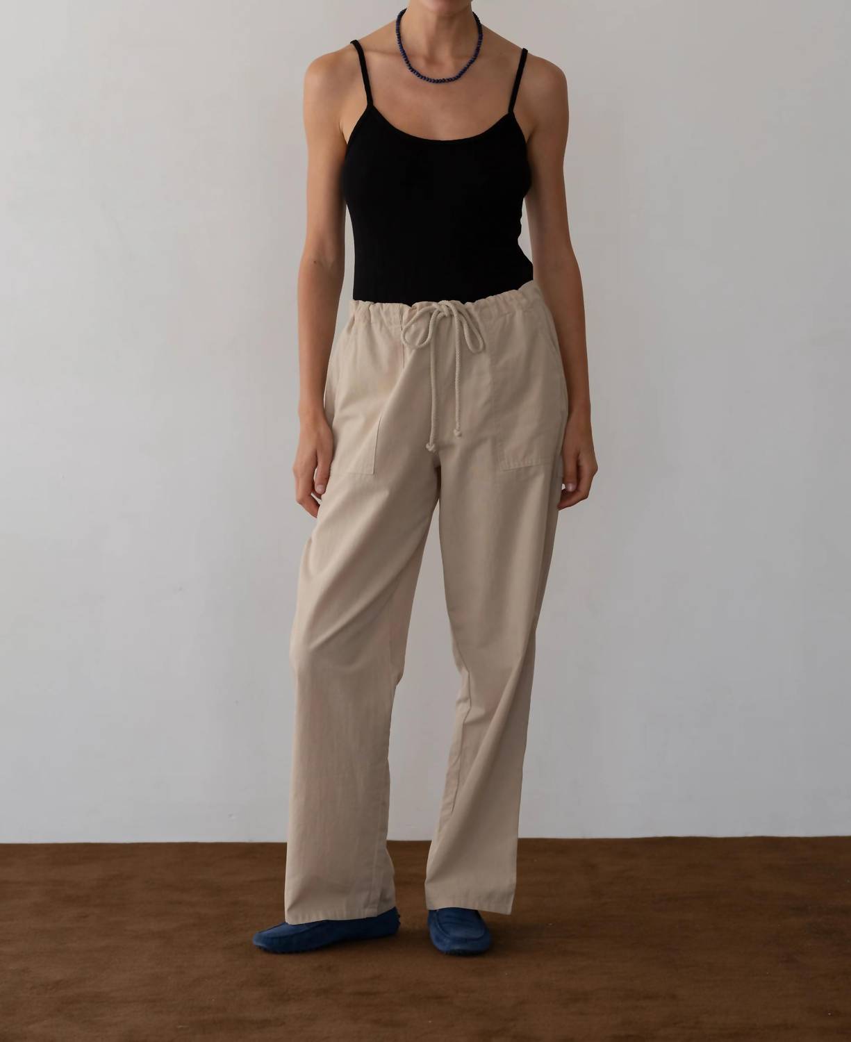 The perfect pant for running around town and looking cool while doing it. Crafted for minimalist style in shitake beige. Full-length, mid-rise pants feature a regular fit with a straight leg, drawcord waistband, and practical side and back pockets with a hammer loop. Made from lightweight 100% cotton. Perfect for vacation wear and easy care: machine wash cold on a delicate cycle and tumble dry low. Model Maya (5’9”, 34” bust, 25” waist, 33.5” hips) is wearing a size small.