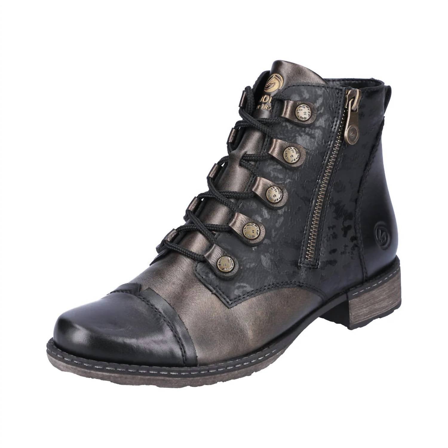 Say hello to the perfect, most versatile boot. The ankle height makes this style easily transition from day to night. Wear them with your favorite skinny jeans and tee for a more laid back look, or pair them with your favorite mini dress and jacket for a night out on the town. Step into modern comfort with the Women's Leather Boot by Remonte. This stylish ankle boot features a round toe design and a practical 1.2" block heel, complemented by a durable thermoplastic rubber sole to ensure grip. Crafted from high-quality synthetic leather, it combines functionality and fashion with a unique lacing and zipper closure for easy wear. Designed with innovative remonteTEX technology, these boots are water-resistant and wind-protective, making them ideal for any weather.