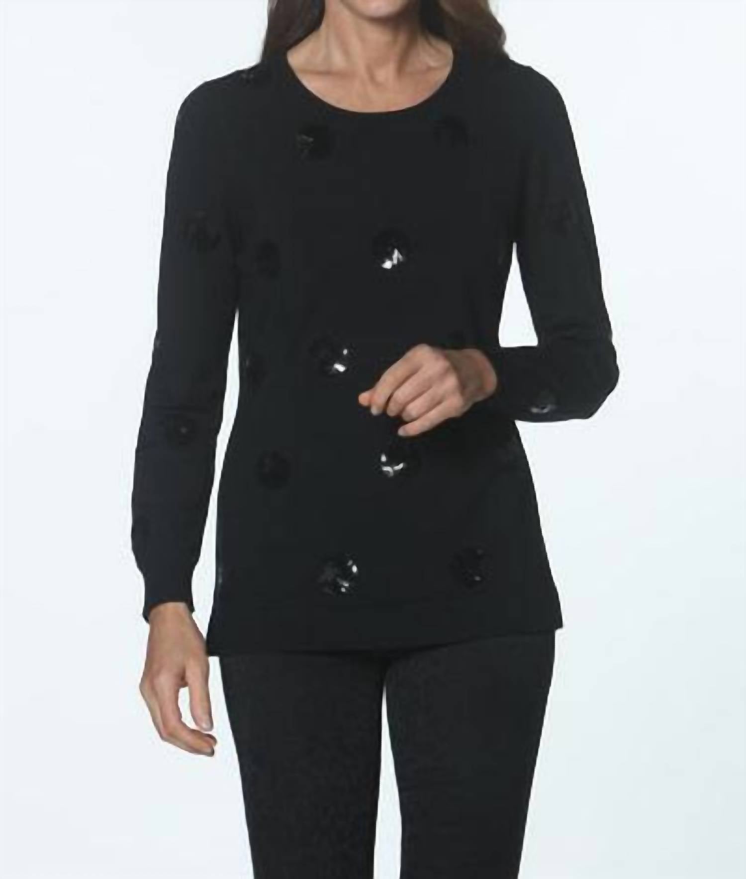 A timeless blouse that will never go out of style. Introducing the Black Sequin Top by J'Envie/Eli, perfect for adding a touch of sparkle to your workwear or festive occasion. This long sleeve sweater boasts a thin knit adorned with sequin polkadots and a stylish crewneck. Composition consists of 72% Viscose and 28% Spandex, providing a comfortable fit. Designed for women, it is made in China and features a convenient pull-on closure. Care for this piece by dry cleaning and laying flat to dry.