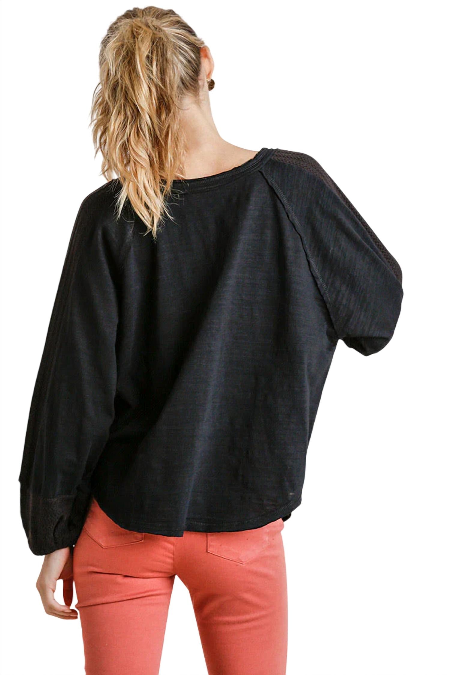 This top features a modified V-wide neckline, raw-edged details, gorgeous contrast knit design on the puff sleeves, and a scoop hem. It has a full cut relaxed silhouette. Small bust 44", length 26". Medium bust 46", length 26". Large bust 48", length 26". XL bust 50", length 27". 1X bust 52", length 27". 2X bust 54", length 27". 100% cotton; contrast is 65% cotton, 35% polyester. Hand wash cold or dry clean. Imported.