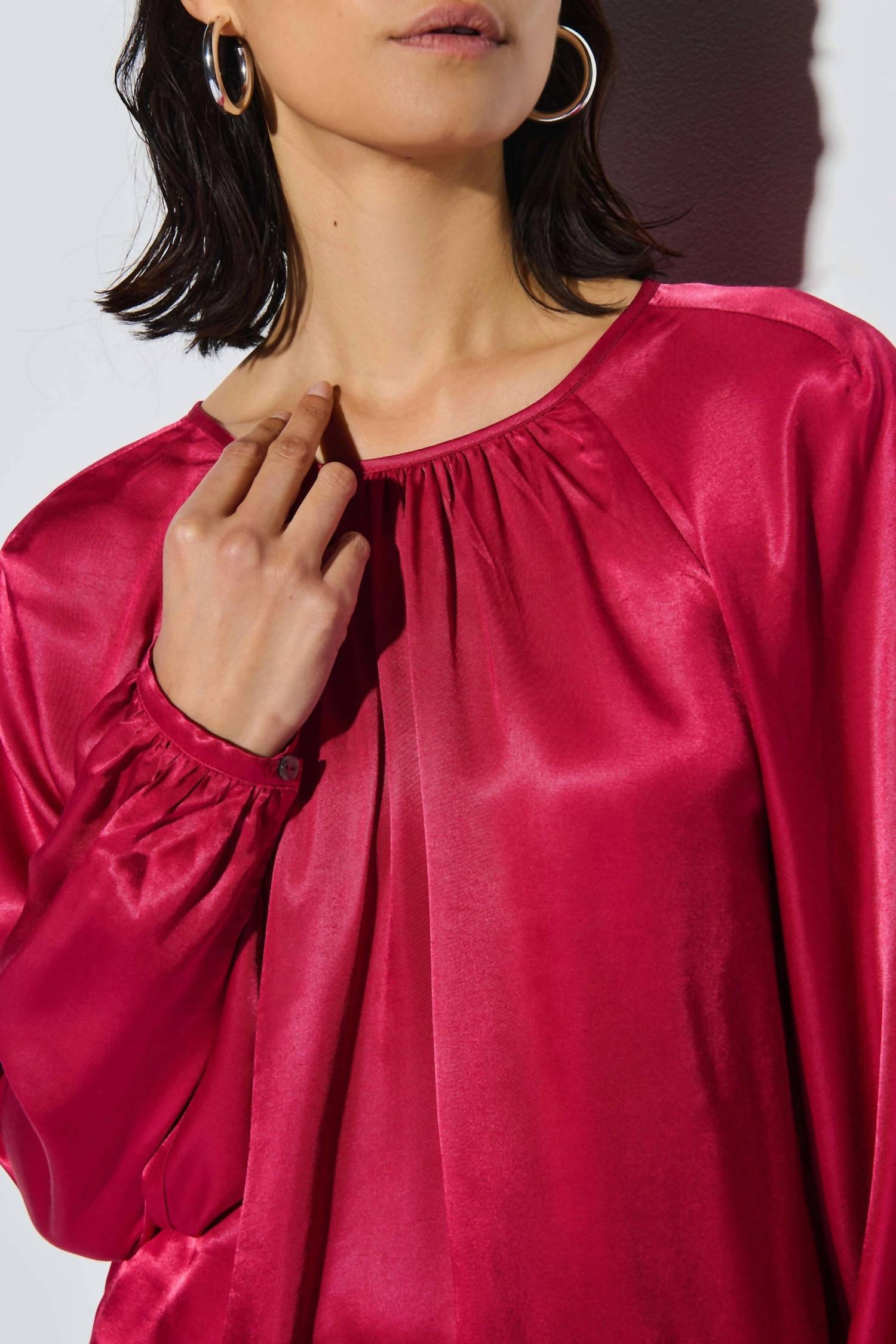 Pair this with your favorite jeans and slides for your next girls night out. Unveiling the Eveline Raglan Top by Nation LTD in a vibrant Raspberry Jam, a perfect blend of style and comfort. This blouse features long sleeves and is crafted from a luxurious viscose blend, offering a smooth, silk-like finish. Its design includes shirring at the neckline and a chic keyhole tie closure for an elegant drape and easy fit. Embrace this effortlessly chic piece that is both bra-friendly and ideal for versatile styling.