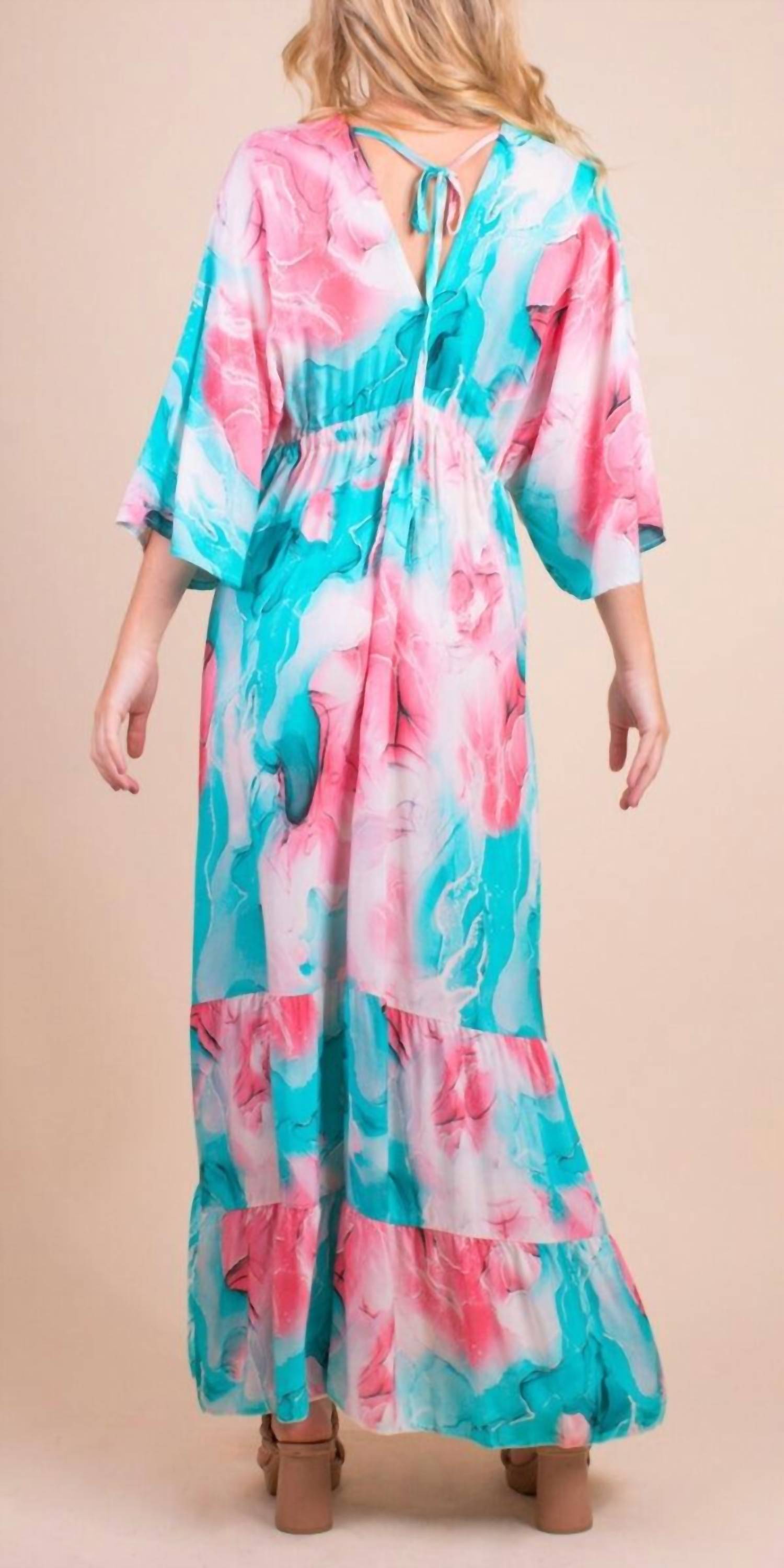 A maxi dress that is just as cute as it is comfortable. Introducing the Primavera Maxi Dress by GIGI MODA, a statement piece in a stunning watercolor print. This turquoise and pink dress features three-quarter sleeves and an elegant V-neckline both at the front and back. Crafted from 100% Viscose, it offers a flowing empire waist silhouette with a ruffled bottom. Originating from Italy, it is best cared for by hand washing and line drying. The dress is finished with a stylish tie closure and is designed for evening events, perfect for fall occasions like Thanksgiving.
