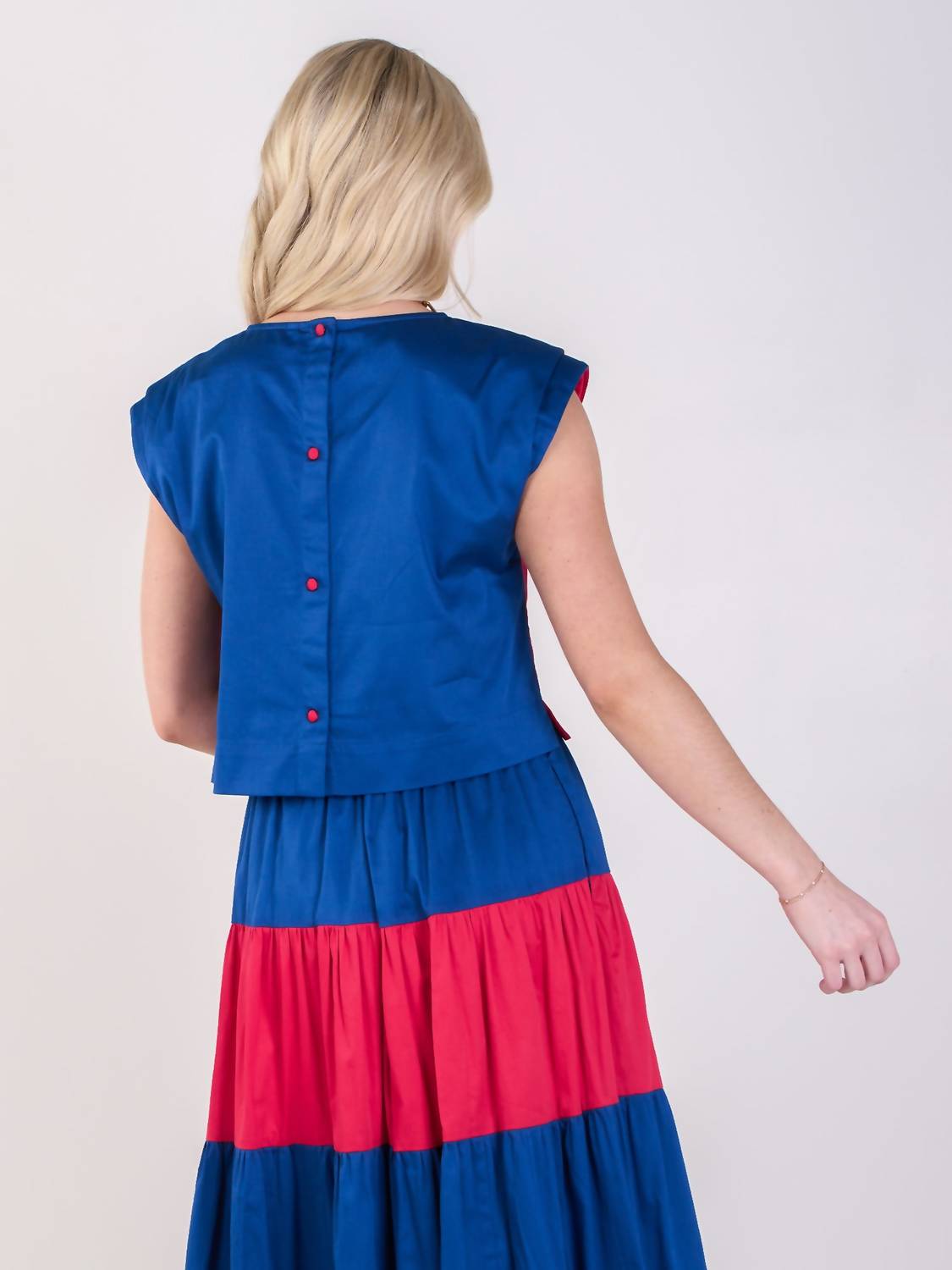 Pair this crop top with your favorite high-waisted jeans or maxi skirt. The Hatti Tank Top by Emily McCarthy is a striking summer staple in a patriotic Americano colorway. This sleeveless piece features a cropped, boxy silhouette with padded shoulders, crafted from a cotton blend of 98% Cotton and 2% Spandex, with a polyester lining. It includes a reversible covered button closure for versatile styling. Care: Delicate cycle with gentle soap in cold water to preserve color and shape, hang to dry.