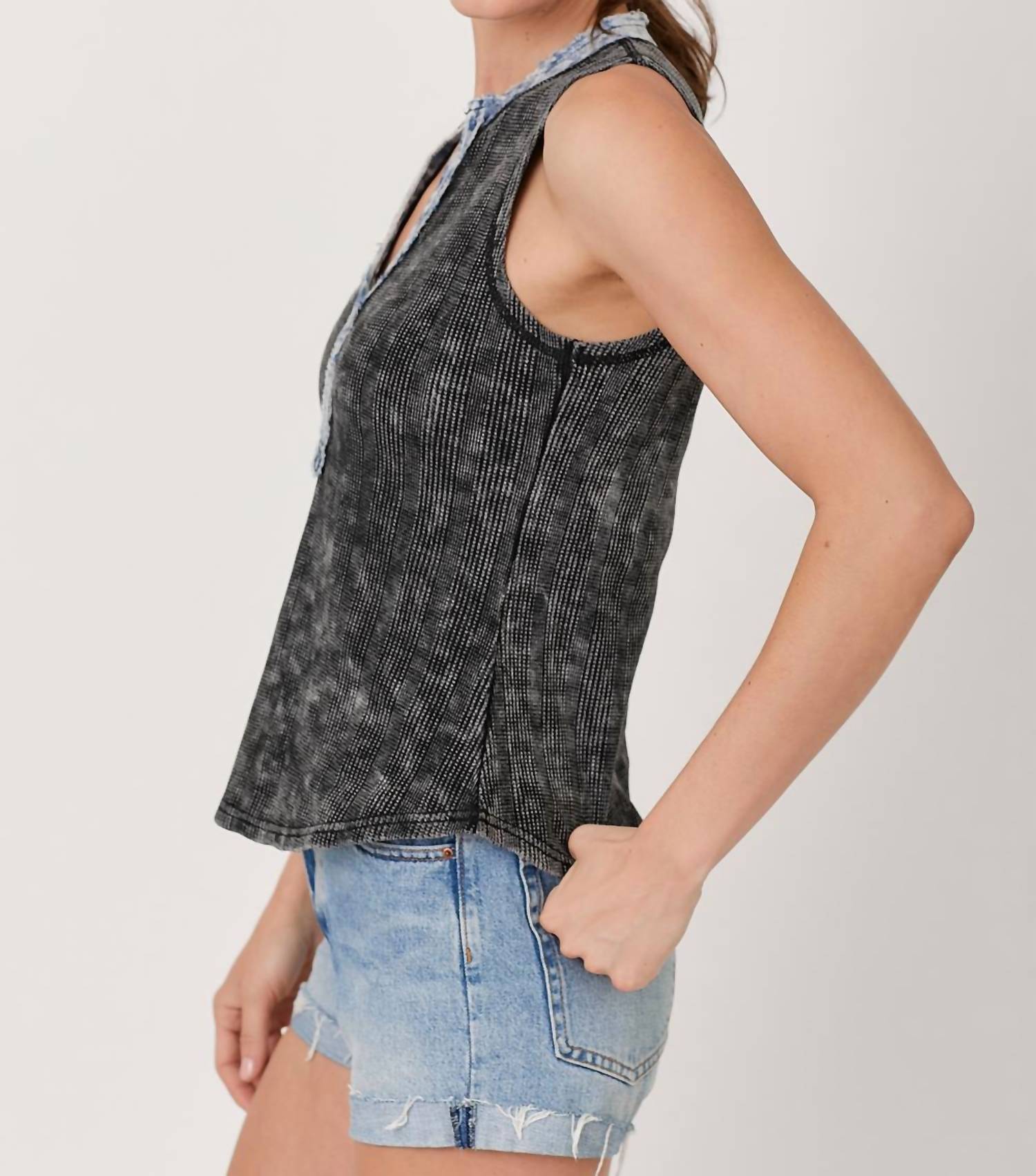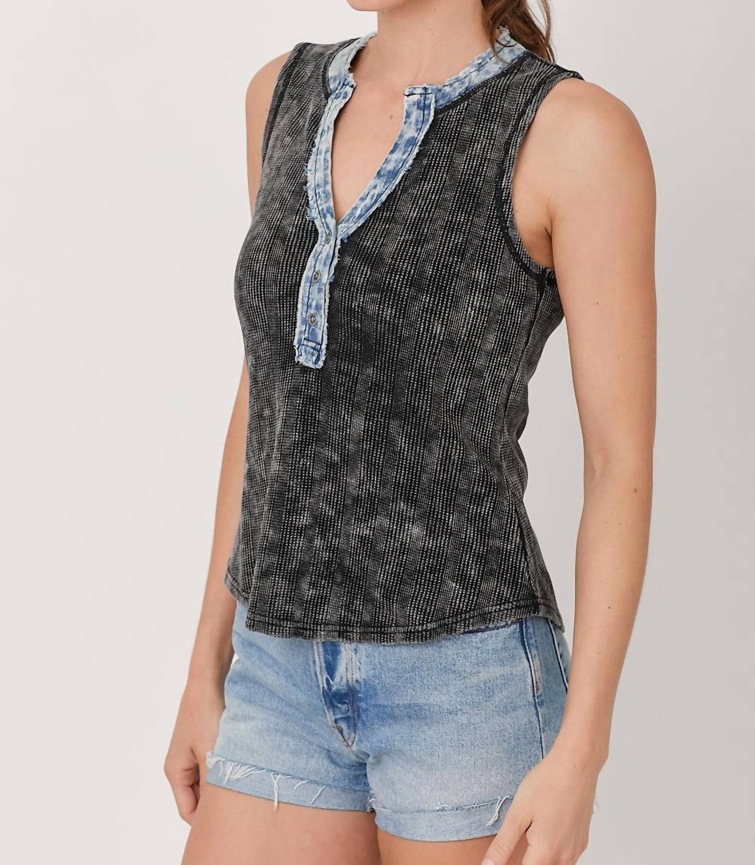 The perfect tank top for those warmer weather seasons. The Washed Thermal Sleeveless Henley Top by Mystree in black offers a modern twist on a classic silhouette. This women’s tank features a textured waffle knit fabric with a split V-neck and button trim, complemented by a high-low hem for added style. Composition includes a self fabric of 94% Polyester and 6% Spandex, with a contrast of 100% Tencel. For care, hand wash and line dry to maintain its maximalist appeal.