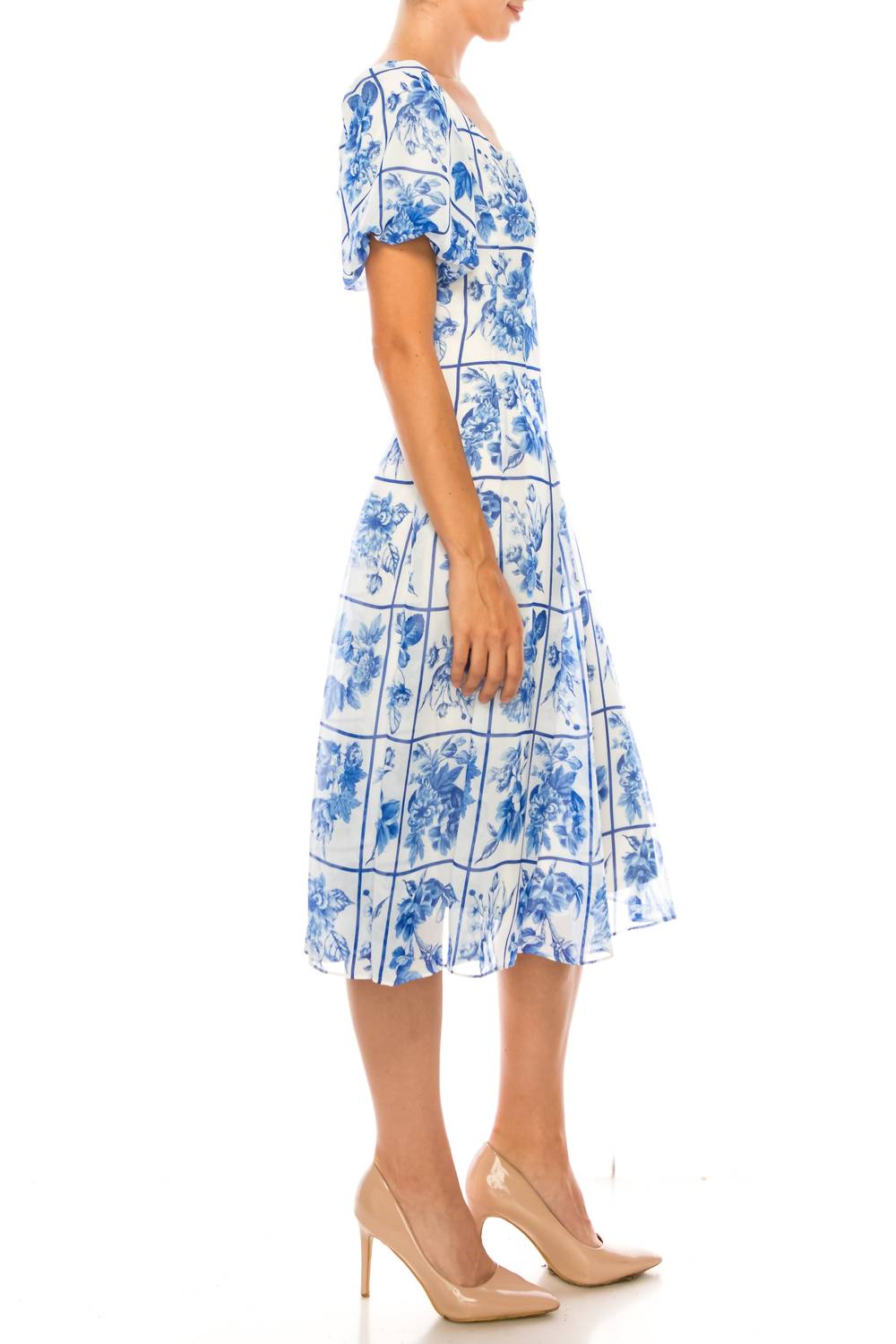 Maison Tara - Square Floral Short Puff Sleeve A-line Midi Dress