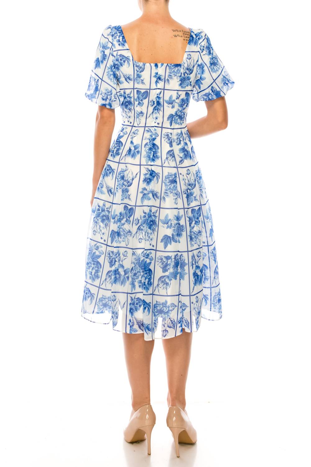 The perfect length dress does exist. Step into elegance with the Maison Tara Square Floral A-line Midi Dress, an effortlessly chic piece for any occasion. Featuring short puff sleeves and a graceful squareneck, this dress boasts a beautiful ivory royal blue floral pattern. Crafted from 100% polyester chiffon, it offers a sophisticated finish with a concealed back zip closure. Care: Hand wash.