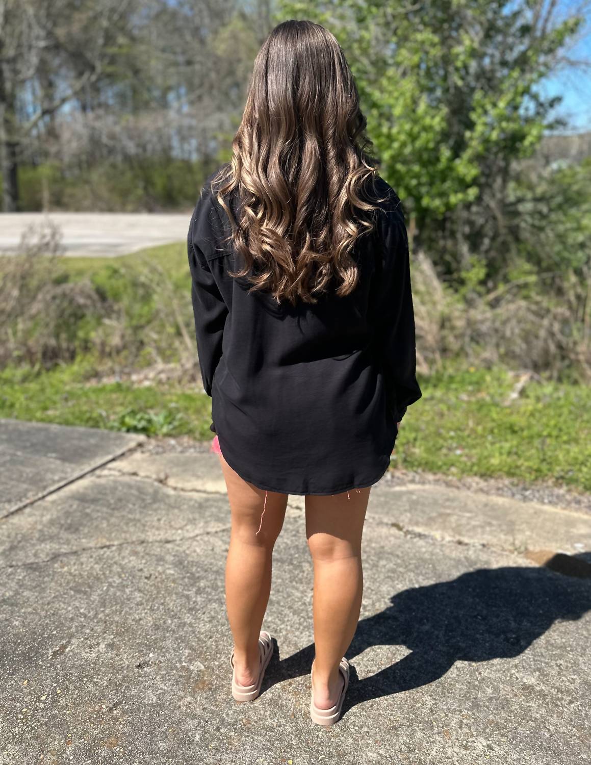 A classic button down shirt that will never go out of style. Elevate your wardrobe with the Plain & Simple Oversized Tencel Shirt by RISEN, designed in a sleek black hue. Boasting long sleeves and a classic collar neckline, this shirt is crafted from 100% Tencel for a luxurious feel. With a button closure and convenient pockets, it offers both style and functionality. The front body length measures 29 1/2" with a chest size of 47" in size S, perfect for a relaxed look.