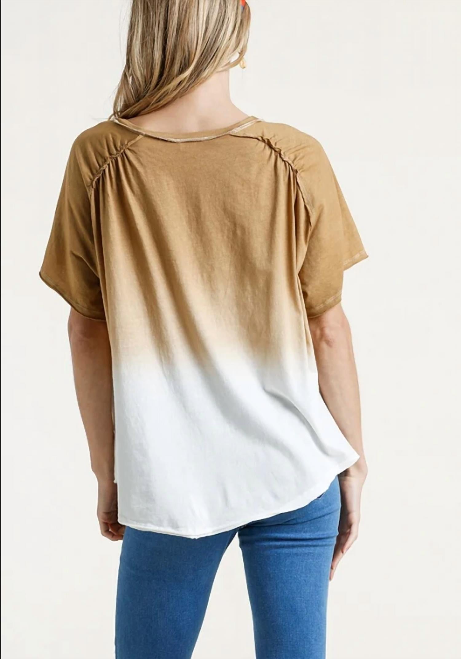 This classic, short sleeve tee will be your go-to staple this season and beyond. Introducing the Dip Dye Raw Edged Top by Umgee, a summer-ready piece in a trendy camel tie-dye design. This short-sleeve tee features a crewneck, a chic raw-edged high low hem, and a practical chest pocket for an effortlessly cool vacation look. Crafted from 100% cotton, it offers a light and flattering fit with a pull-on closure for easy wear. Care instructions recommend hand washing cold to maintain its stylish appeal. Available sizes: Small, Medium, Large with a consistent length of 26 inches. Imported.
