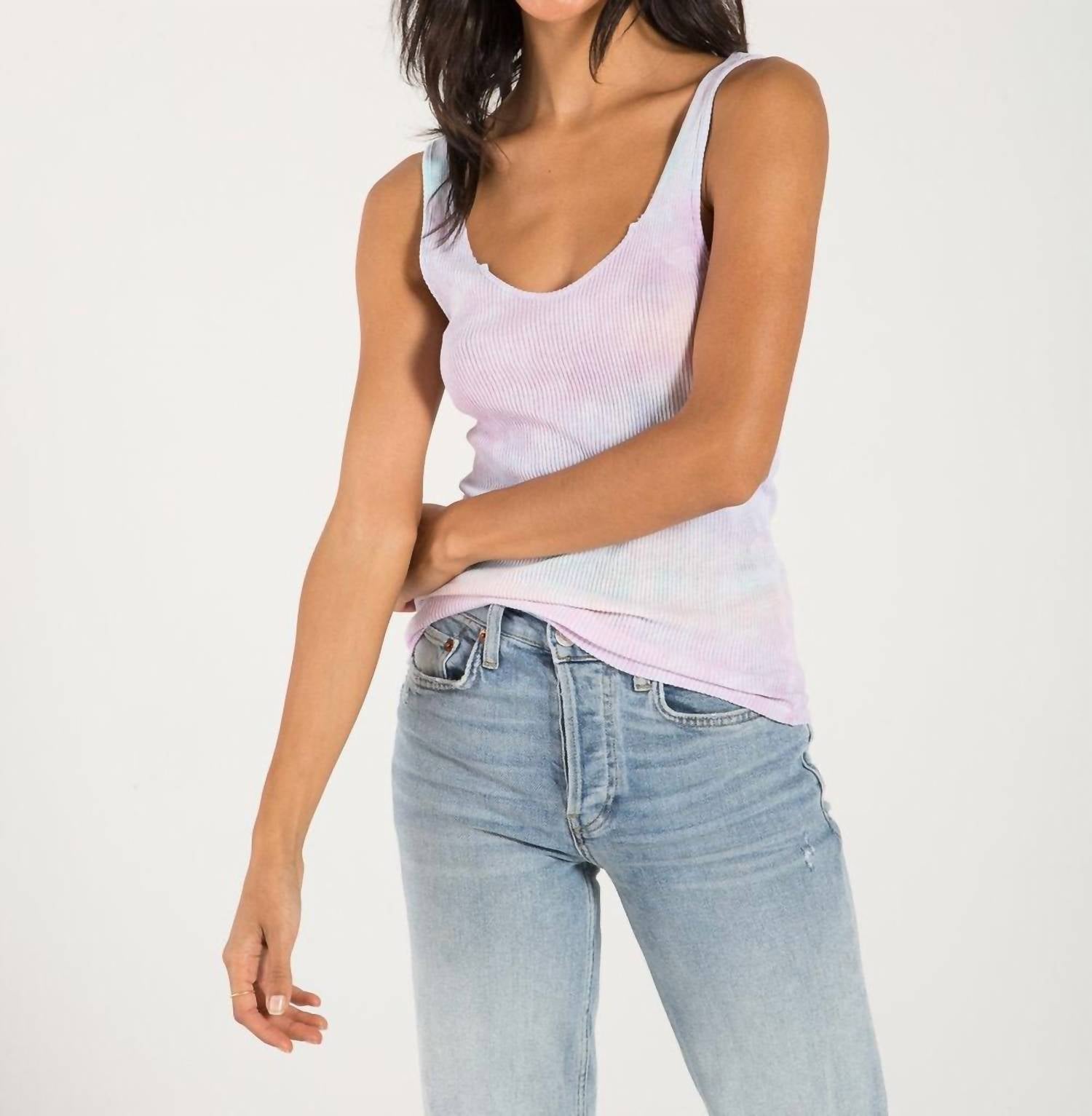 The Bourbon tank by n:Philanthropy is a fitted and ribbed tank, with a raw edge front neckline. There is a hand sewn metal plaque on the wearer’s left hem. This tank is hand tie-dyed so every garment may vary slightly in look. Dress it up with jeans and a blazer, or rock it with your favorite workout gear!Wash cold delicate, like colors.  Lay flat to dry.Made in LA