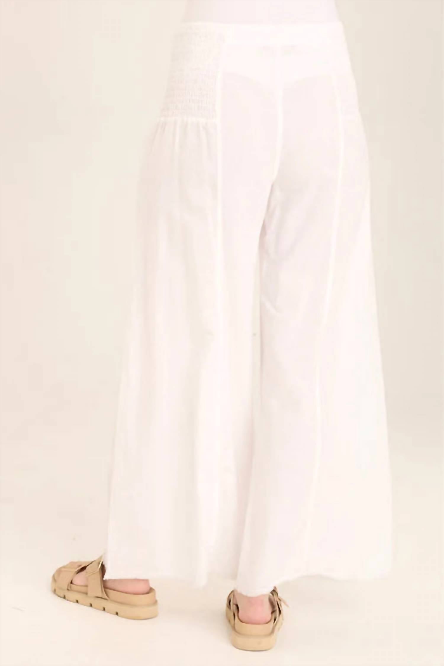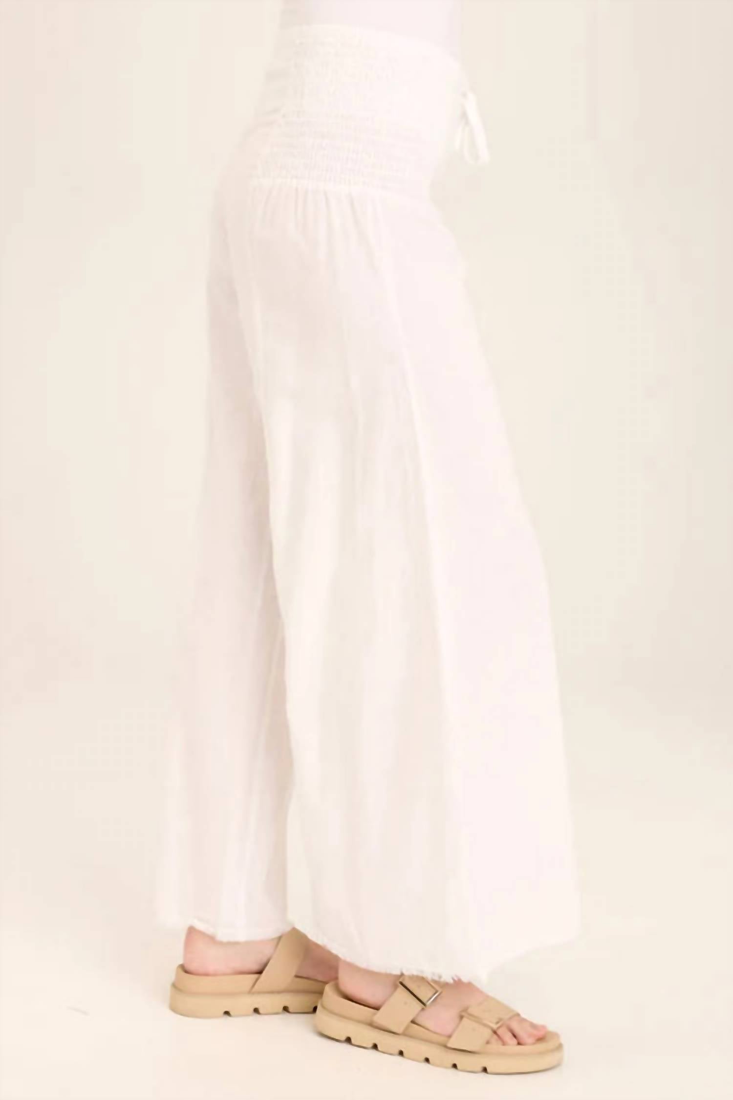 Introducing the XCVI Kaj Wide Leg Pants in classic white, a perfect choice for a minimalist, sophisticated wardrobe. Crafted from a linen blend, these textured pants feature a ruched waist with a high-rise and a flattering 11.75-inch rise, complemented by a flared, wide leg. With a pull-on closure, these pants are both stylish and easy to wear, boasting a 30-inch inseam. Ideal for spring occasions like Thanksgiving, they are machine washable for effortless care.