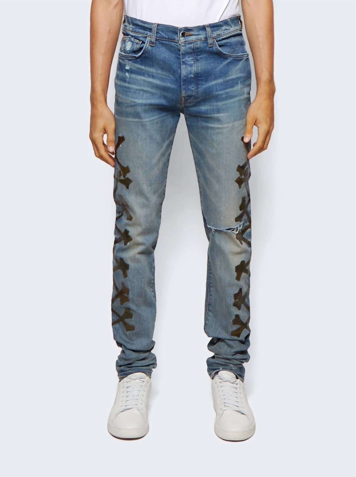 Experience the unique style of the Amiri Camouflage Bones Jean in stonewashed tones, perfect for a streetwear-inspired vacation look. These slim fit, straight leg jeans are crafted from a 92% cotton blend, featuring elastomultiester and elastane for added stretch. Made in the USA, they boast a mid-rise waist with a button fly closure and a 5-pocket design, enhanced by intentionally destroyed details and camo printed bovine leather patches. Care instructions recommend dry clean only to maintain the integrity of this trendy piece.