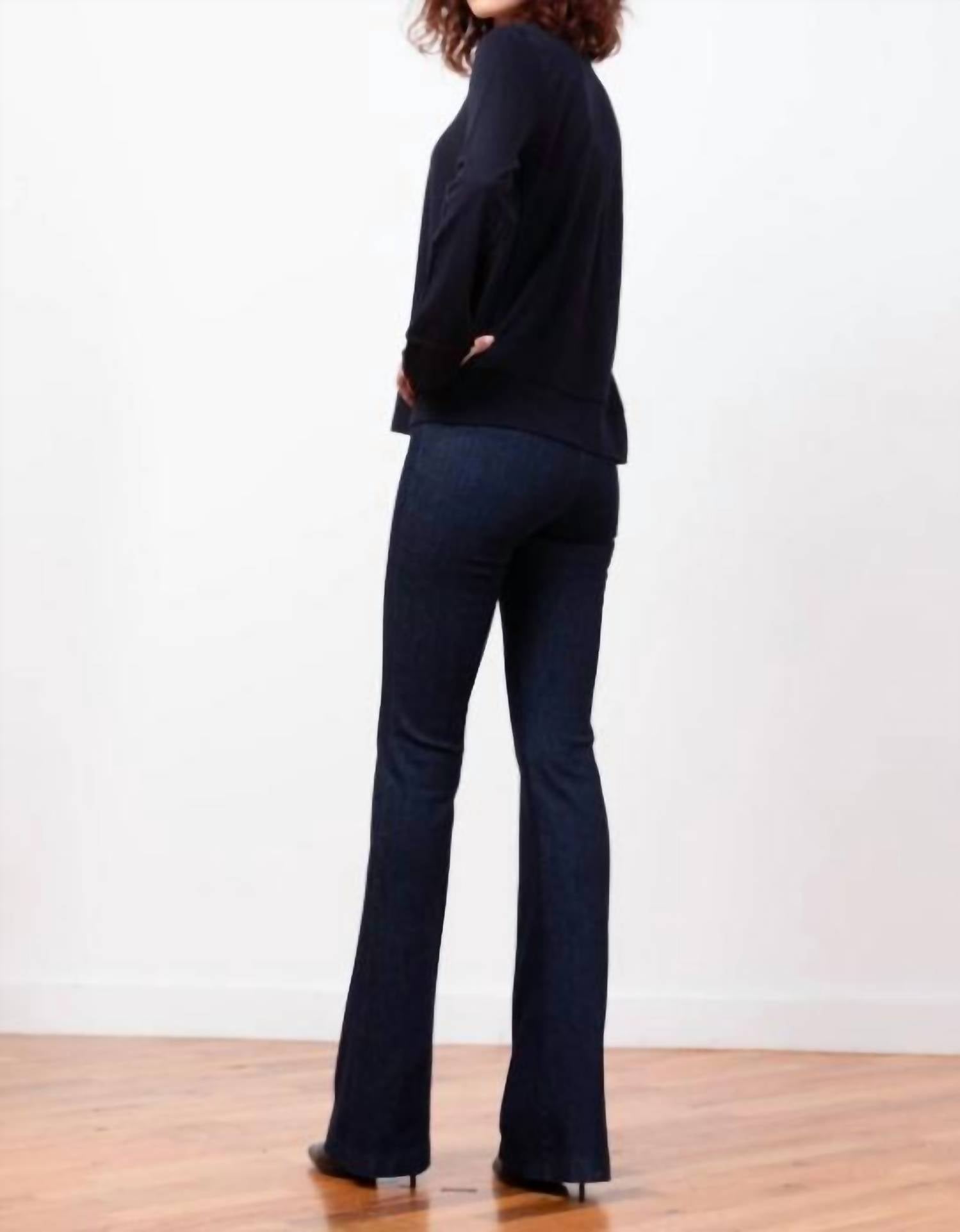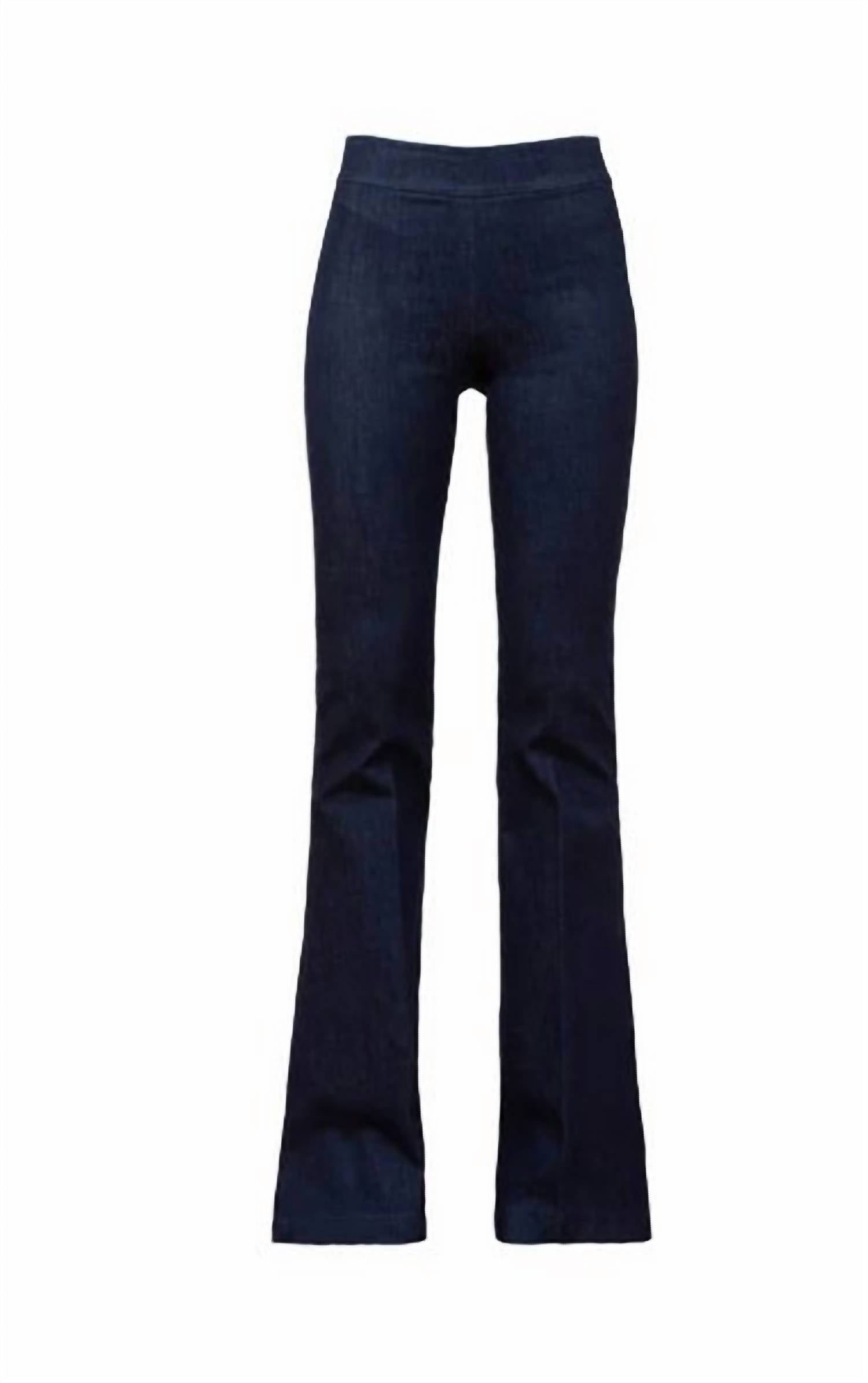 Pair these wide leg jeans with mules, slides or your favorite strappy sandals. Elevate your wardrobe with the Bellini Pant by Avenue Montaigne, crafted for a flattering fit in dark denim. These full-length flare pants are designed with a slimming fit through the thigh and a dramatic flare leg for a standout look. Made from classic, stretchy denim, they provide comfort and style for everyday wear. With a 34” inseam, the model is wearing size 0, and it’s recommended to take one size up for the perfect fit.